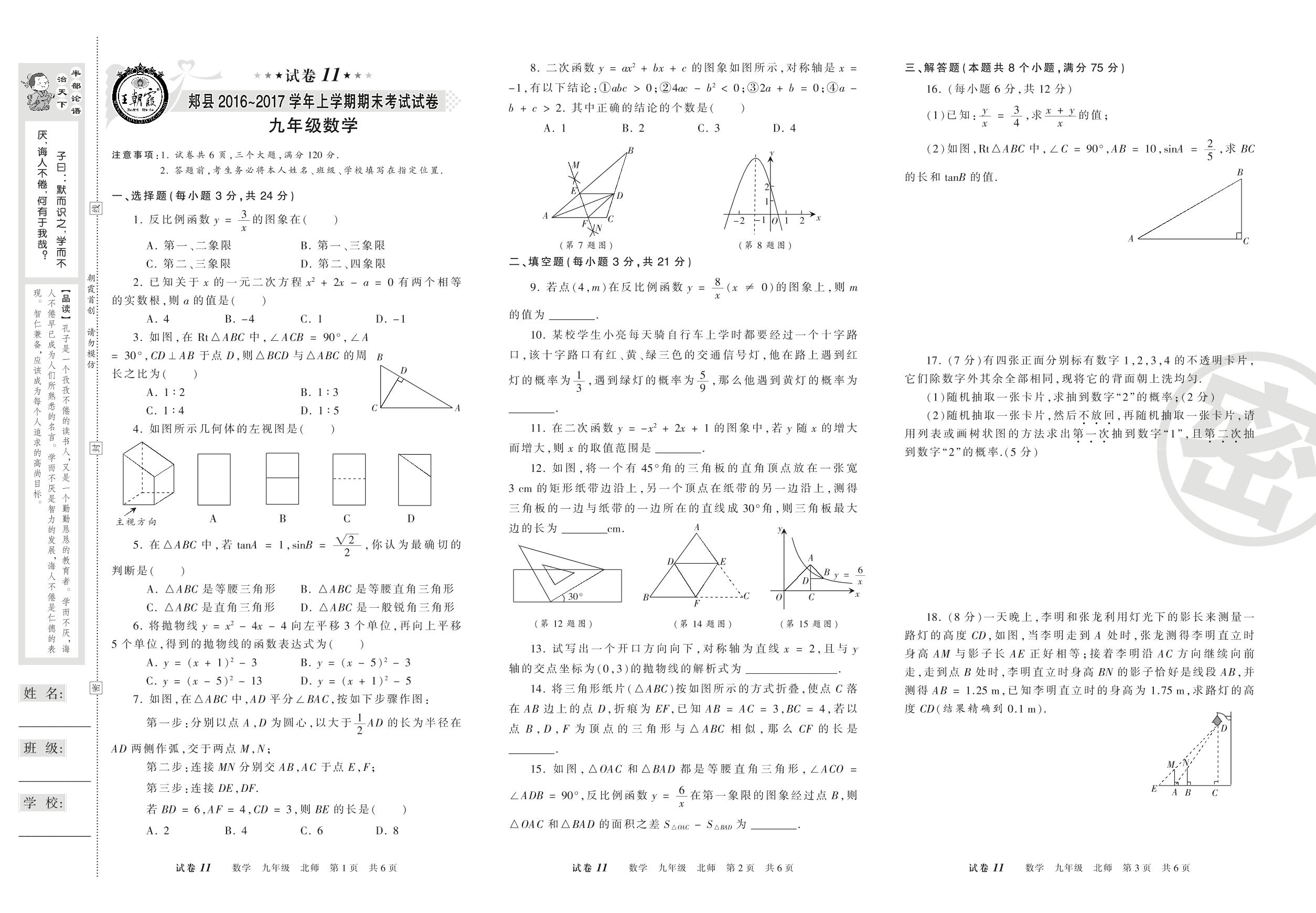 2016-2017学年第一学期平顶山市郏县九年级数学试卷(北师版)【11】