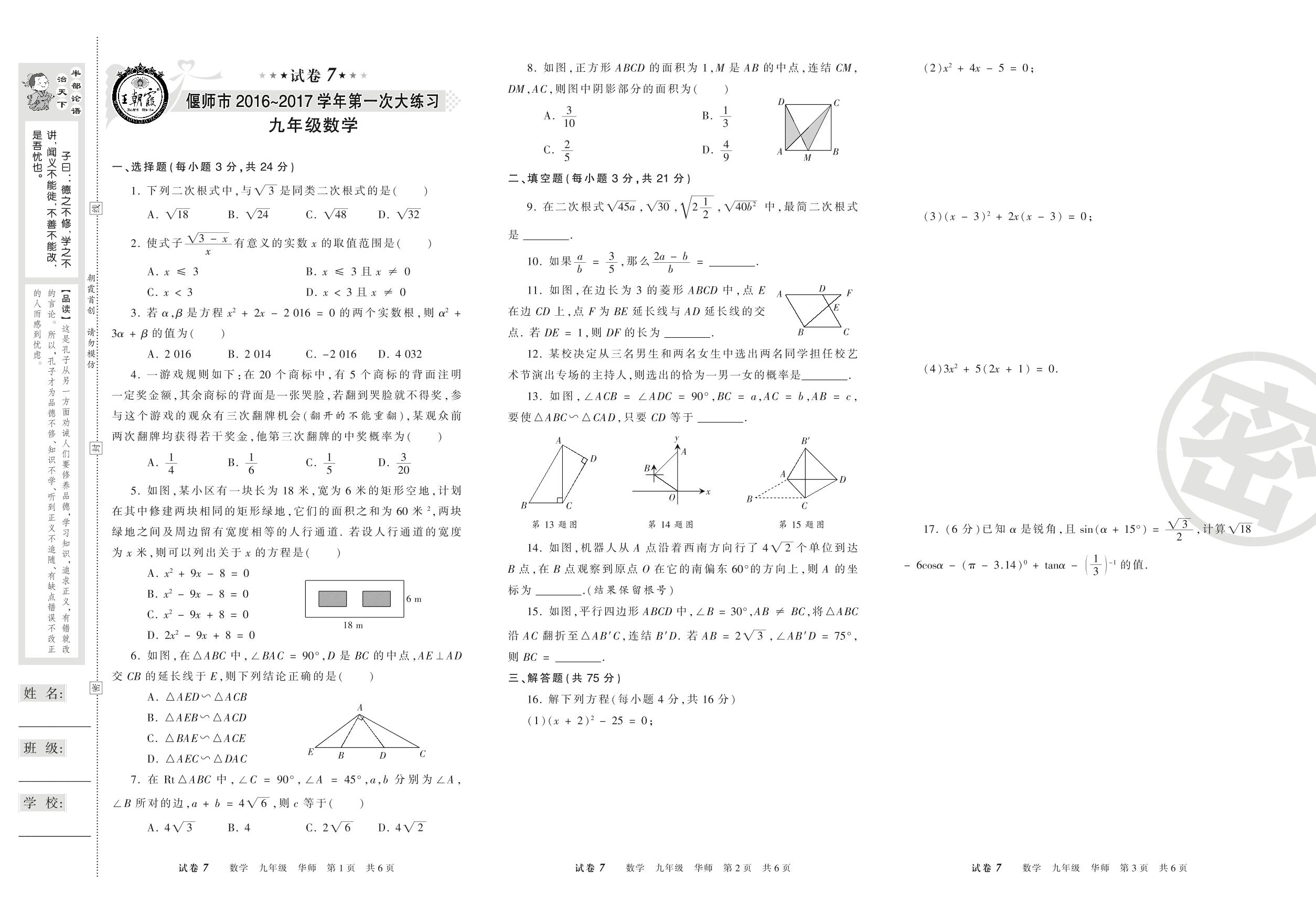 2016-2017学年第一学期偃师市九年级数学试卷(华师版)【7】