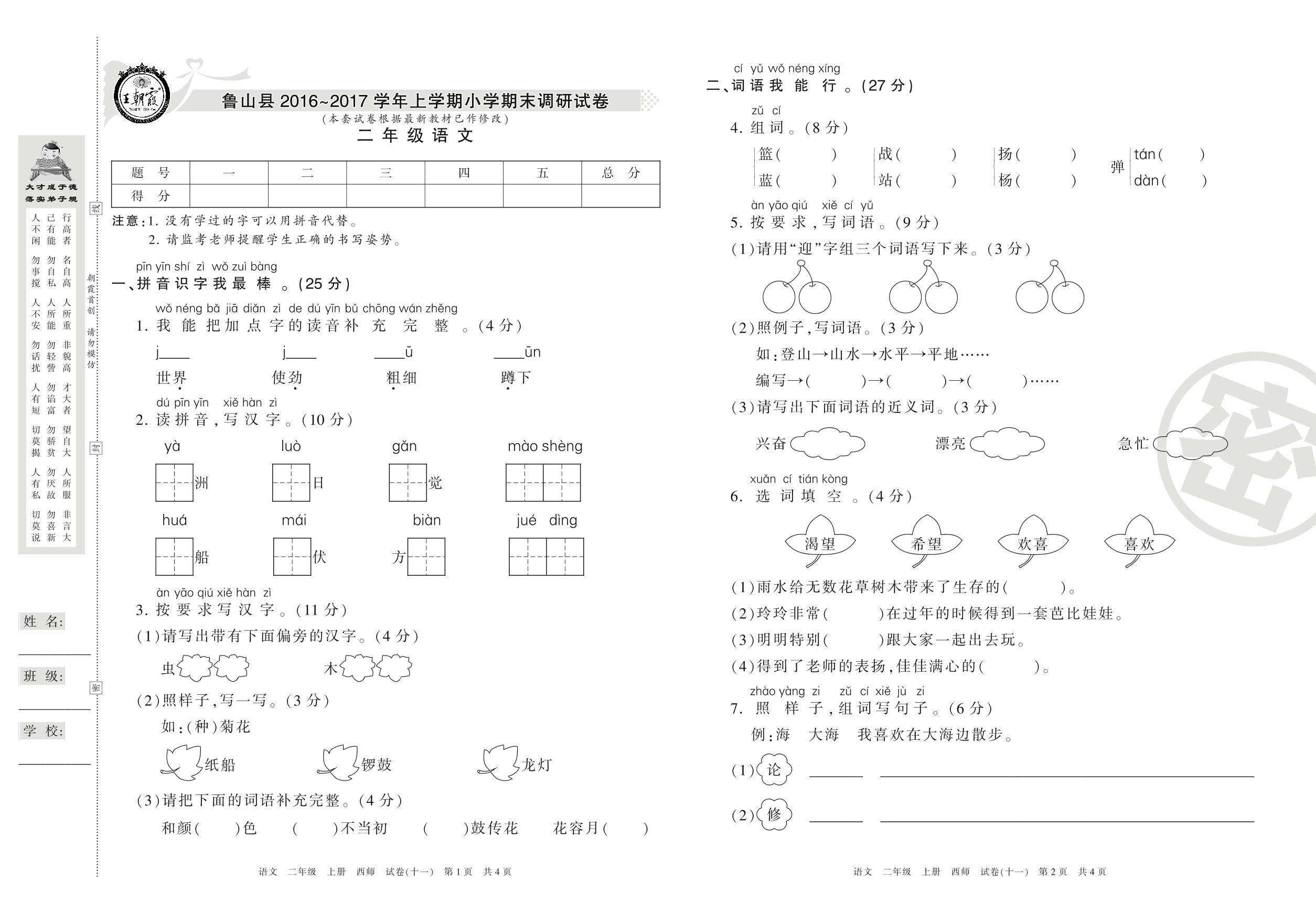 2016-2017学年第一学期平顶山市鲁山县二年级语文试卷(西师版)【11】