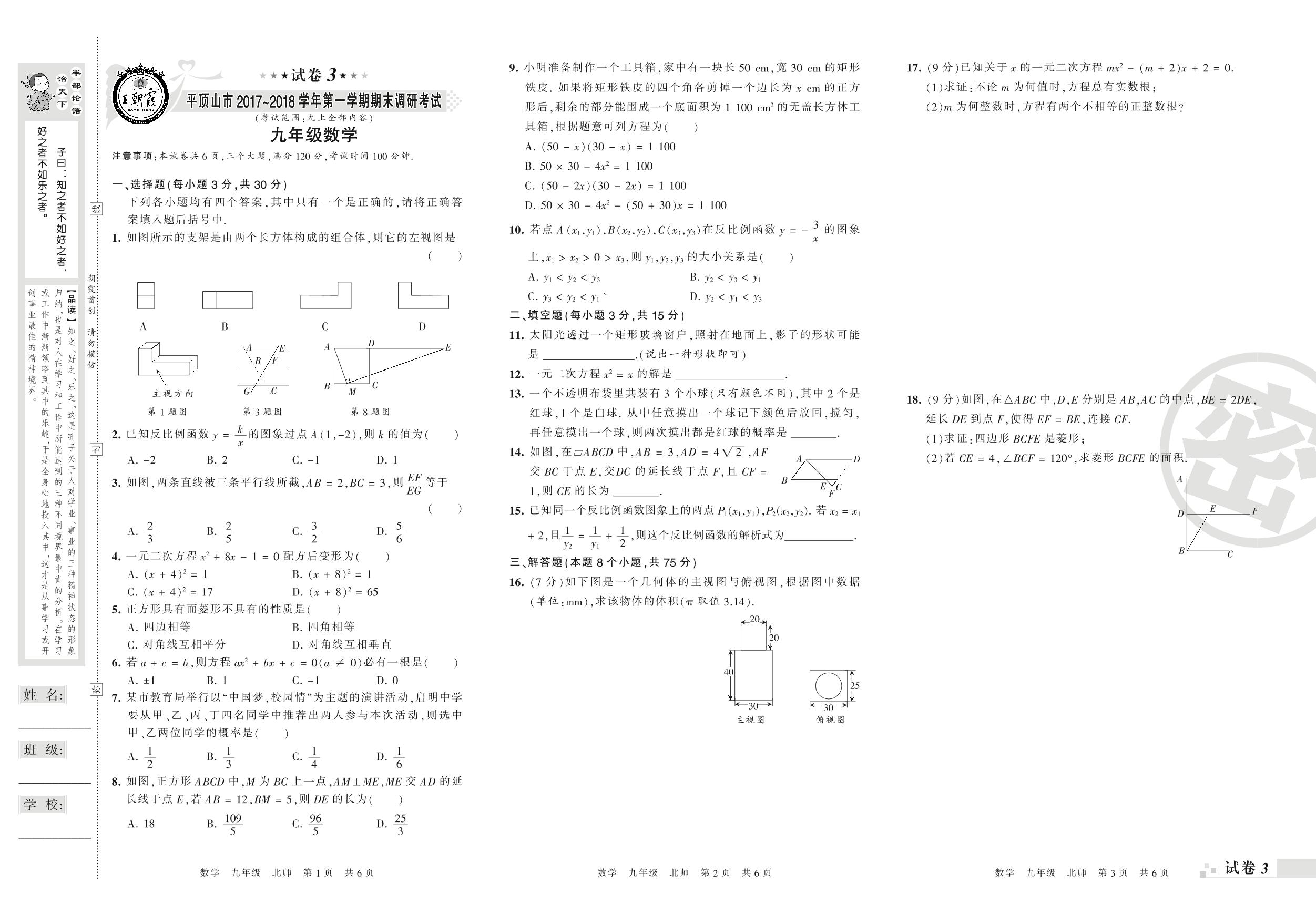 2017-2018学年第一学期平顶山市九年级数学试卷(北师版)【3】