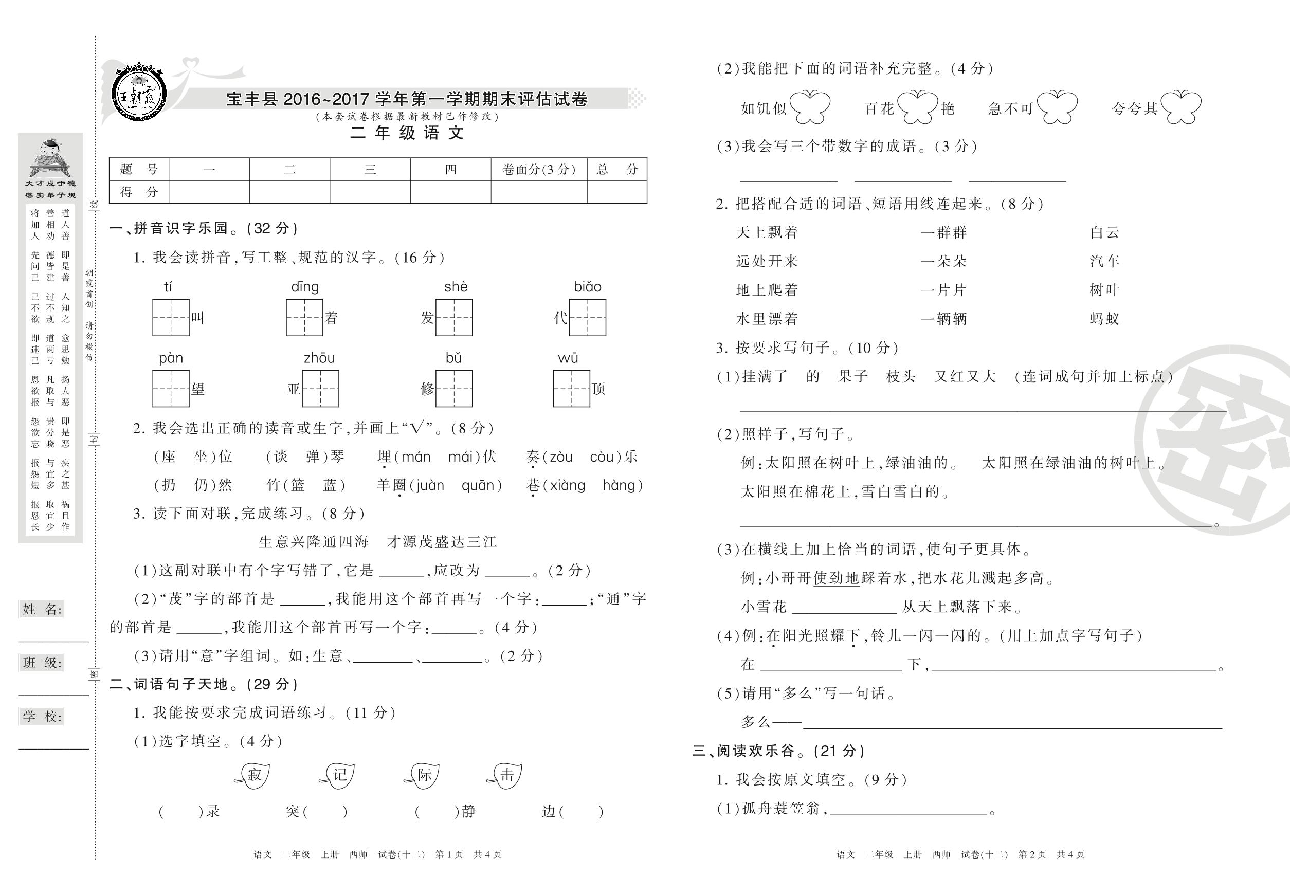 2016-2017学年第一学期平顶山市宝丰县二年级语文试卷(西师版)【12】