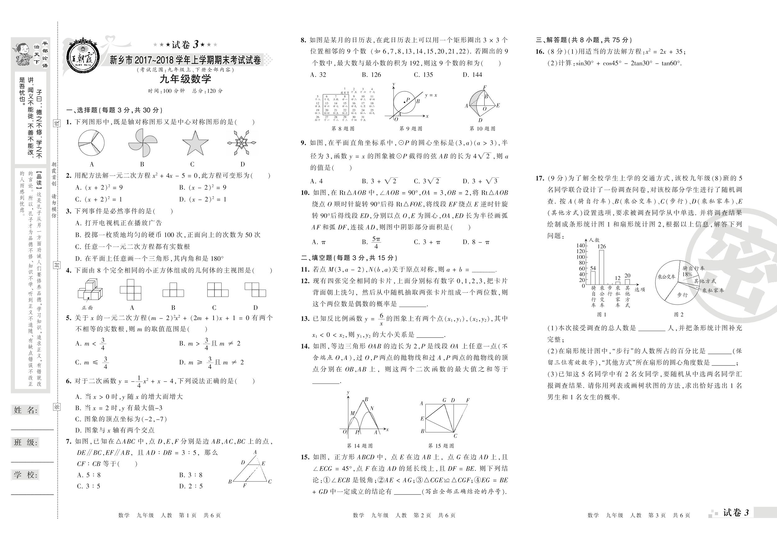2017-2018学年第一学期新乡市九年级数学试卷(人教版)【3】