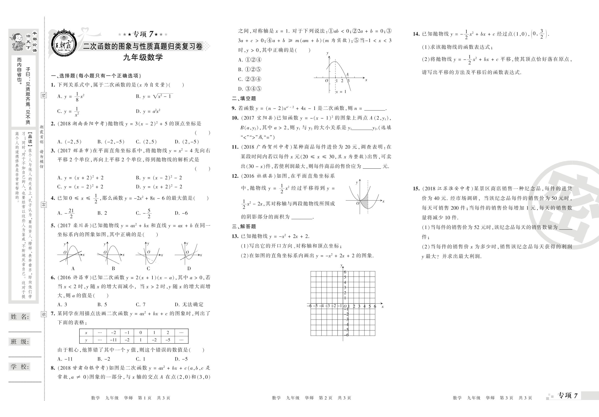 王朝霞期末专项卷——二次函数的图像与性质、二次函数的应用真题归类复习九年级上册数学(华师版)