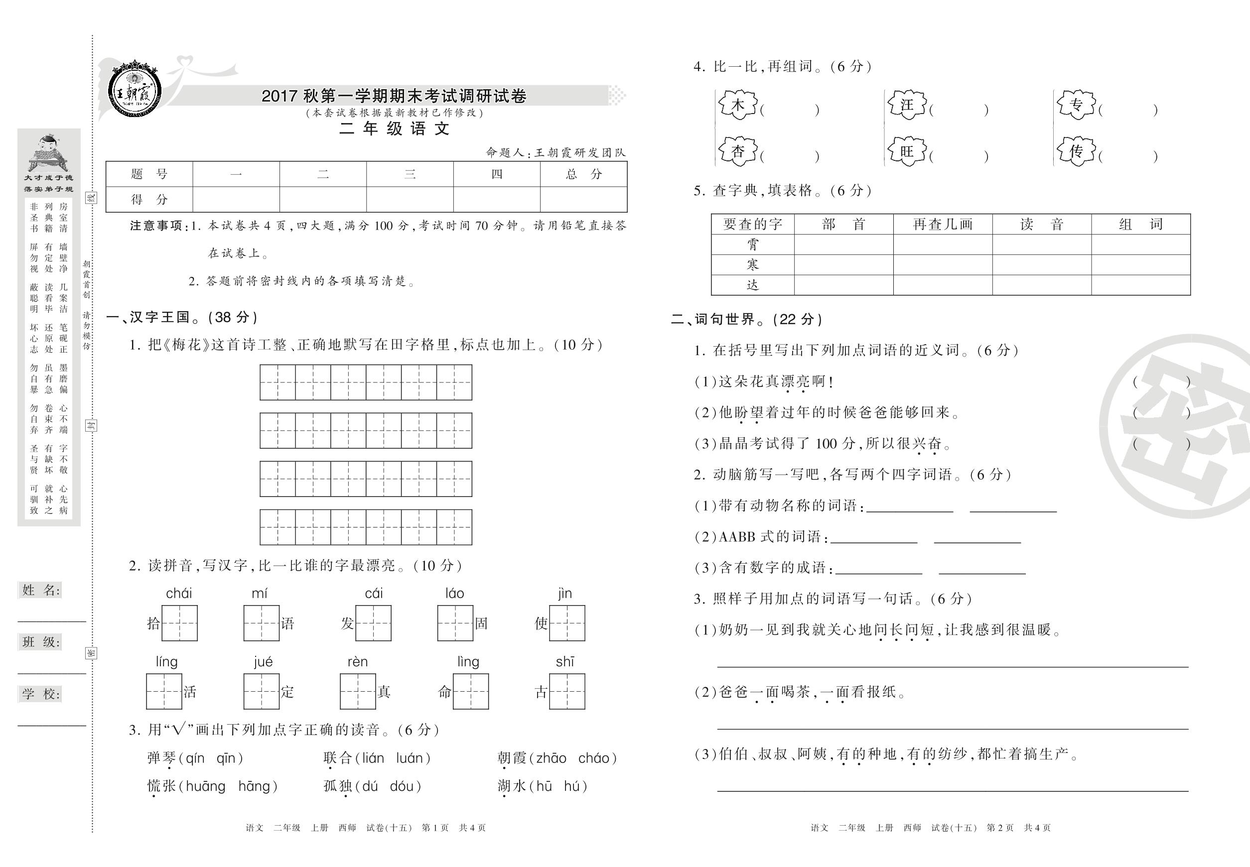 王朝霞期末调研卷二年级上册语文(西师版)【15】