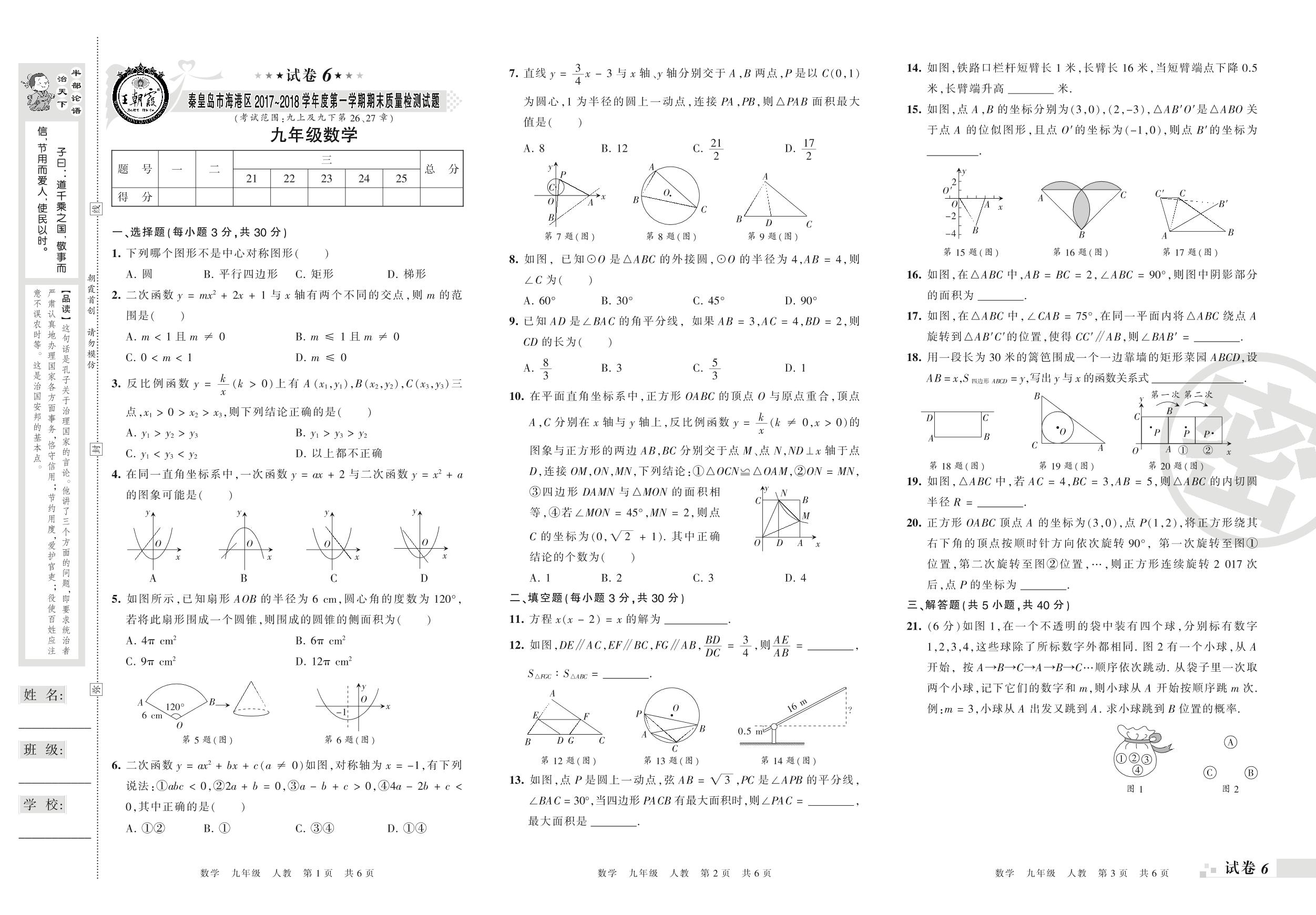 2017-2018学年第一学期秦皇岛市海港区九年级数学试卷(人教版)【6】