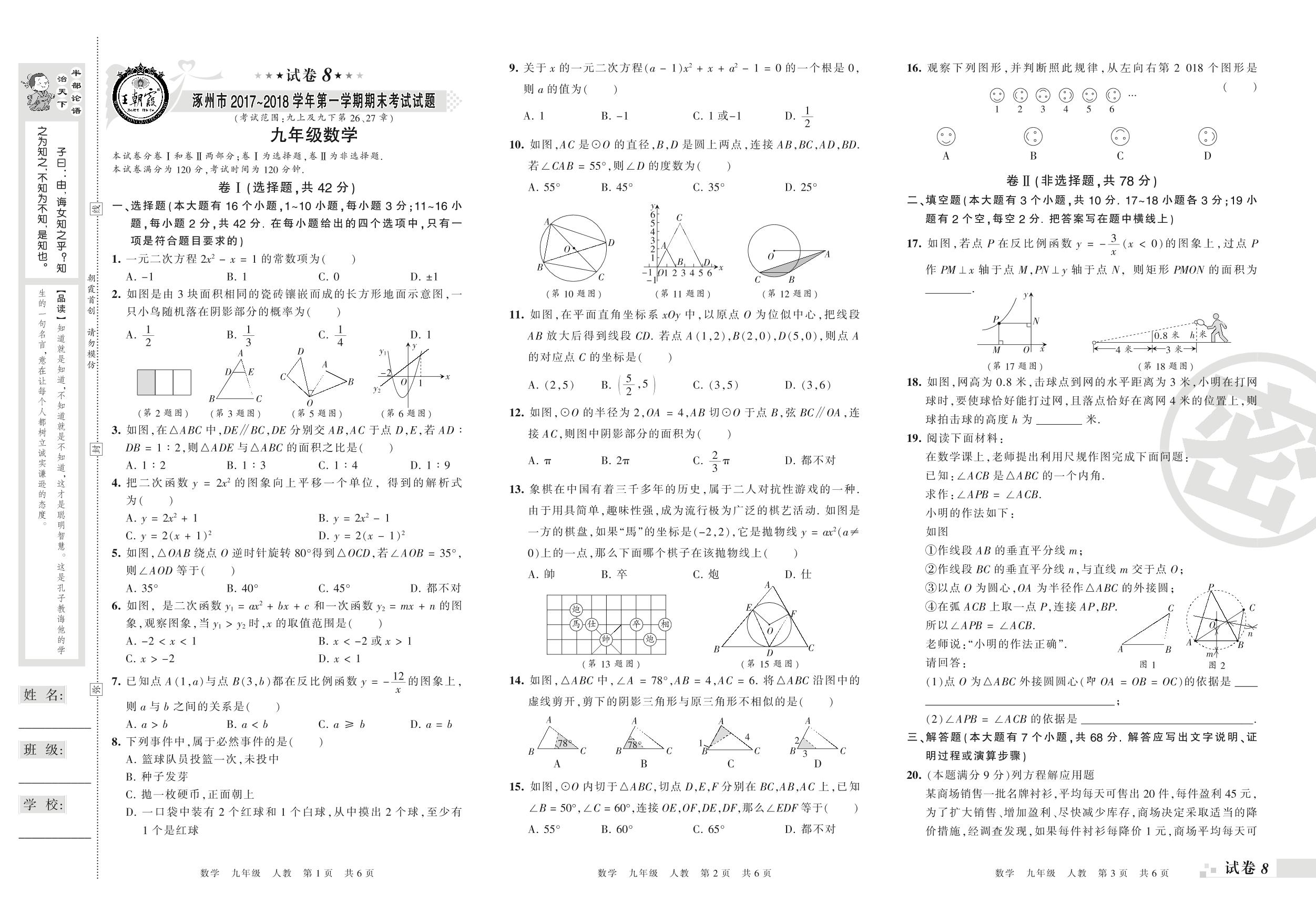 2017-2018学年第一学期涿州市九年级数学试卷(人教版)【8】