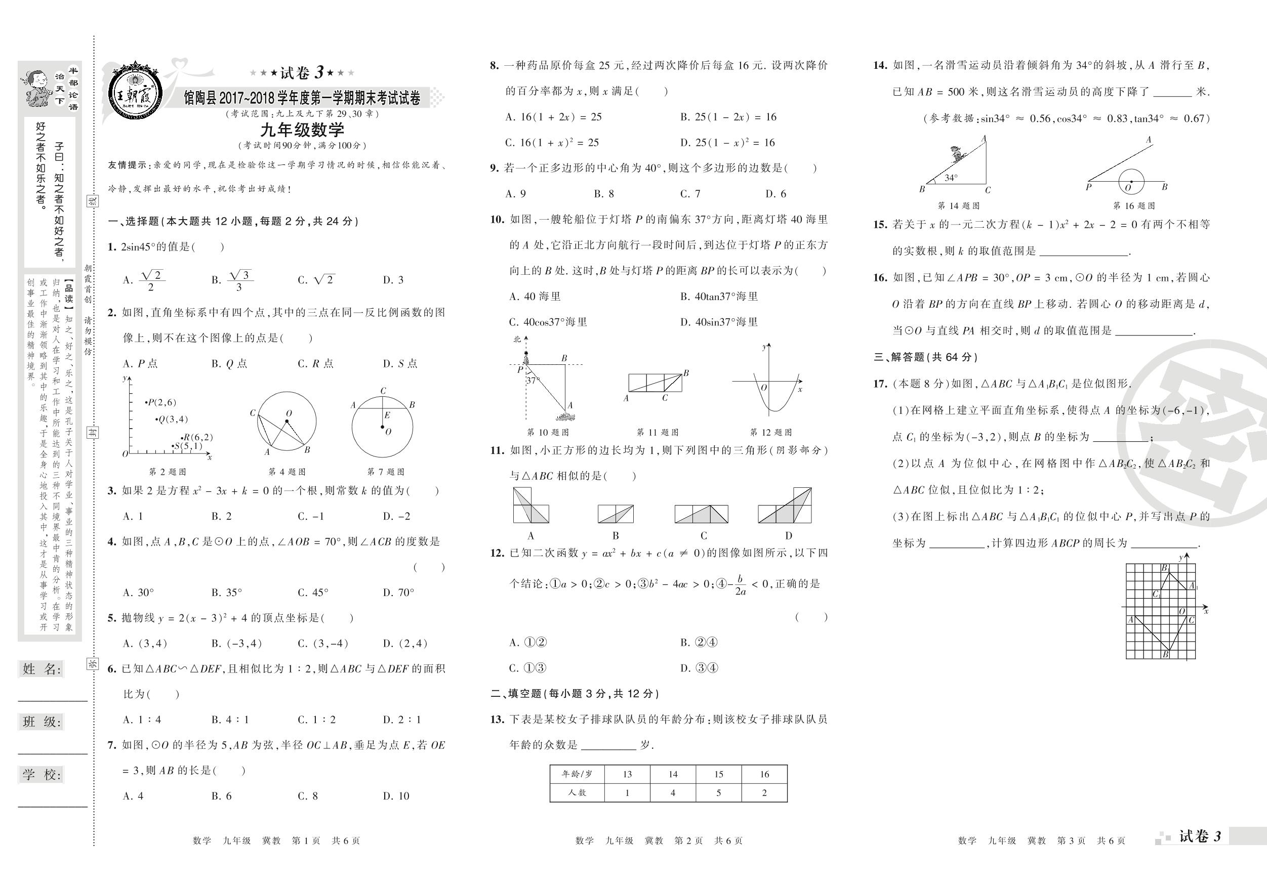 2017-2018学年第一学期邯郸市馆陶县九年级数学试卷(冀教版)【3】