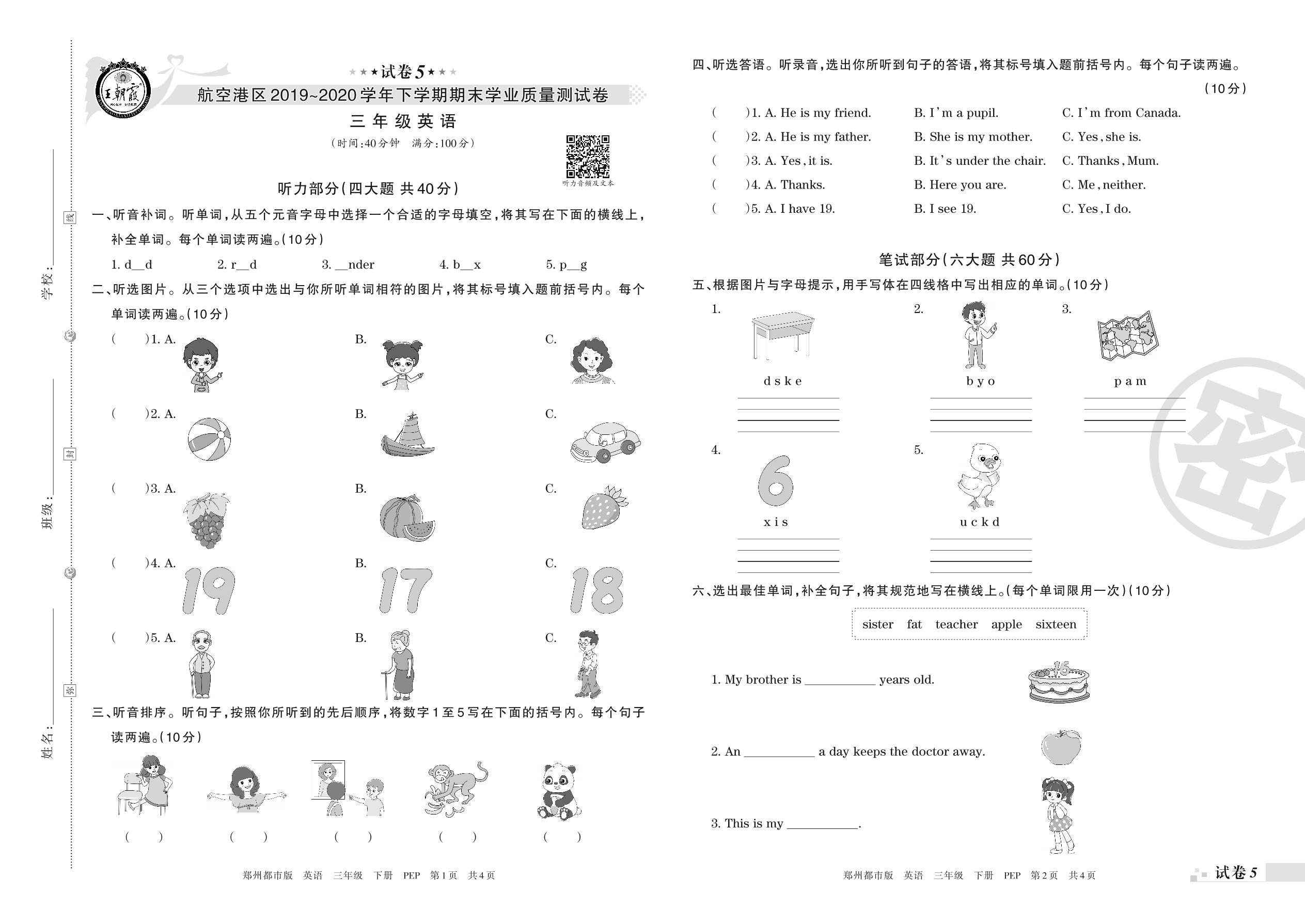 2019-2020学年第二学期郑州市航空港区三年级英语试卷(PEP版)【5】