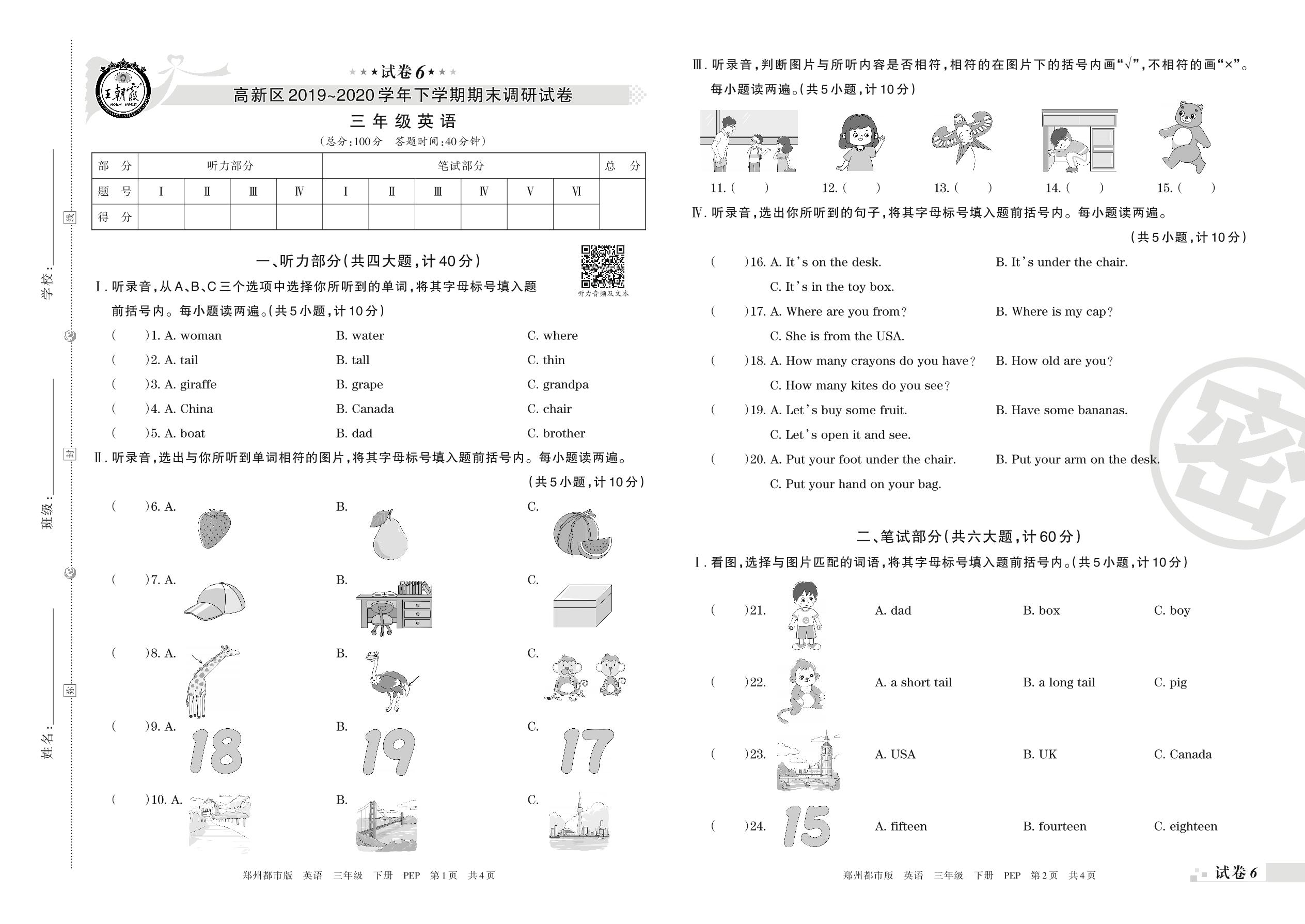 2019-2020学年第二学期郑州市高新区三年级英语试卷(PEP版)【6】