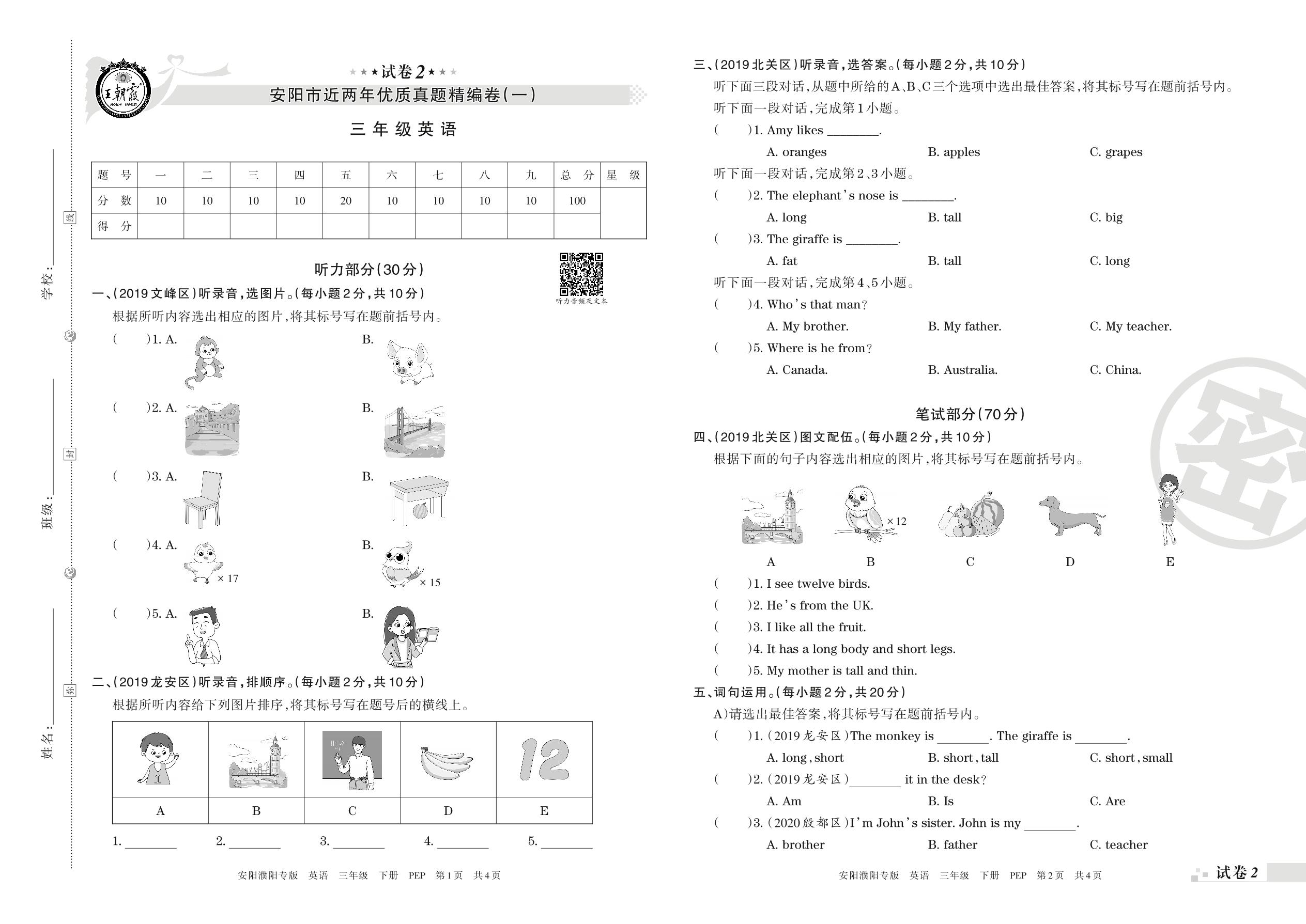 安阳市近两年优质真题精编卷(一)三年级下册英语(PEP版)【2】