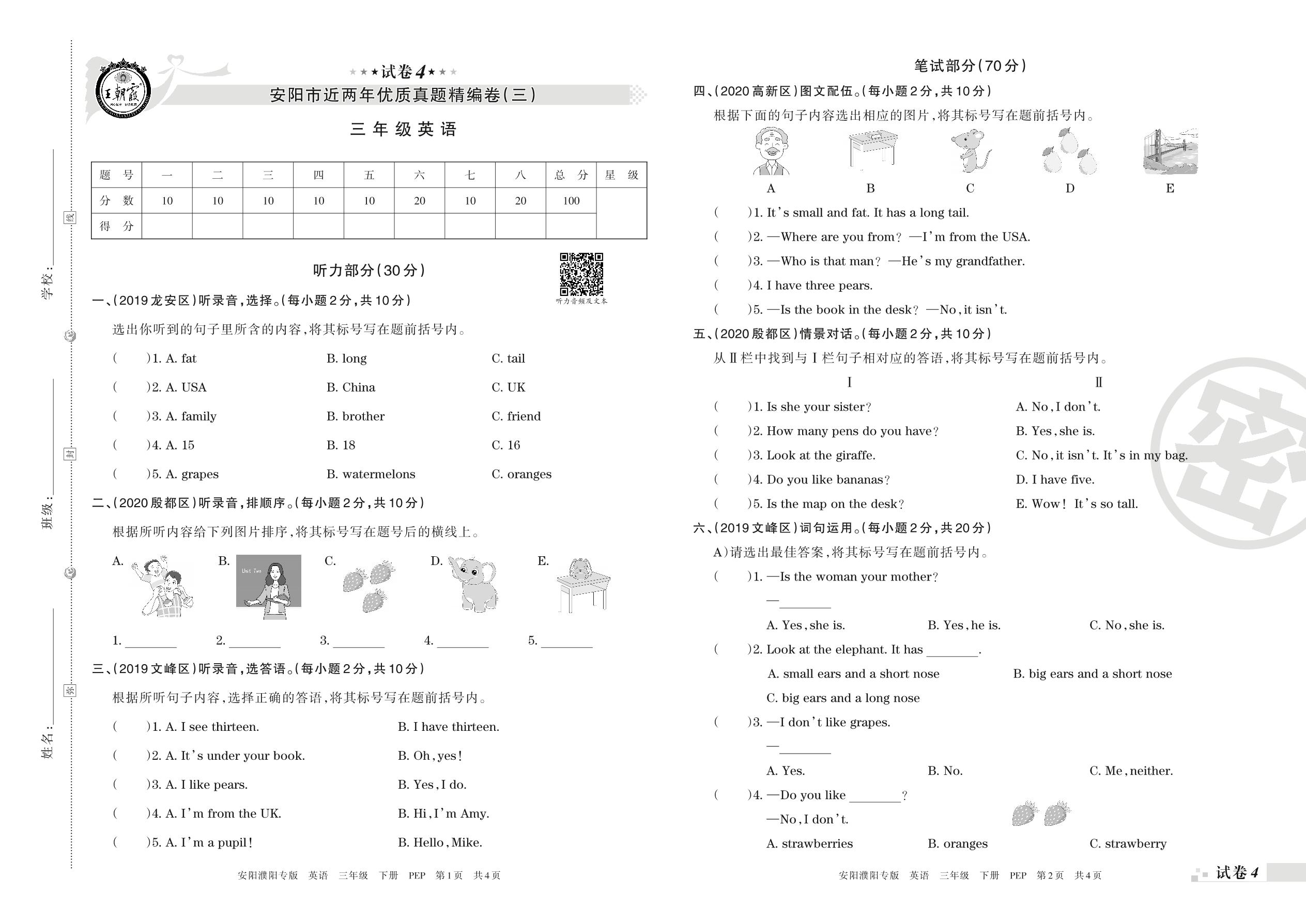 安阳市近两年优质真题精编卷(三)三年级下册英语(PEP版)【4】