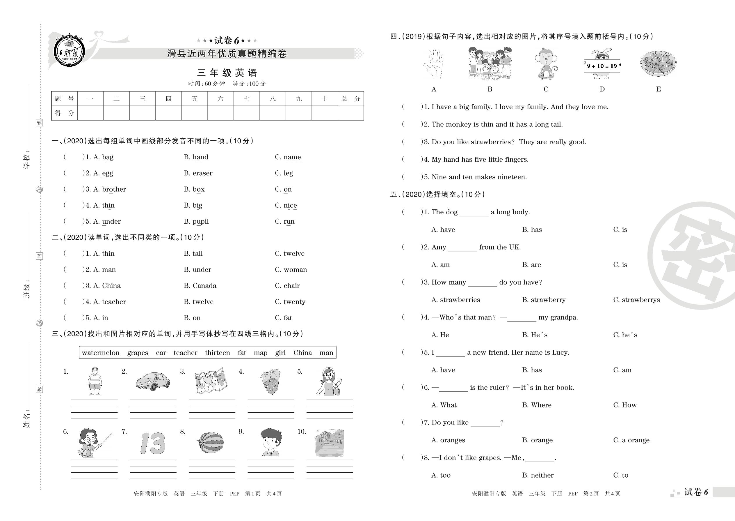 2019-2020学年第二学期安阳市滑县近两年优质真题精编卷三年级英语试卷(PEP版)【6】