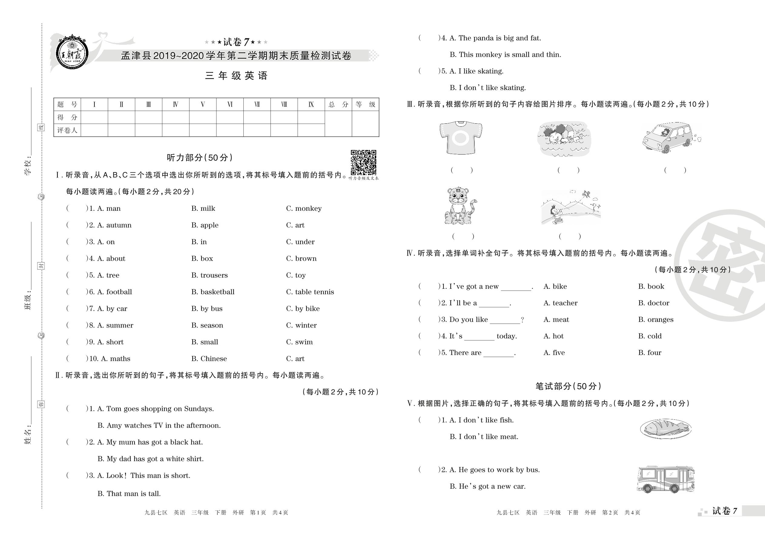 2019-2020学年第二学期洛阳市孟津县三年级英语试卷(外研版)【7】