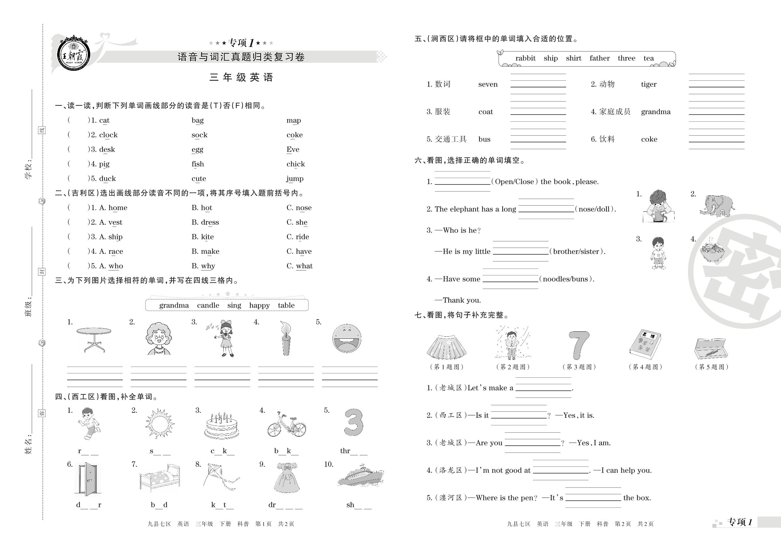 王朝霞期末专项卷——语音与词汇、句子真题归类复习三年级下册英语(科普版)_R210806181957【0】