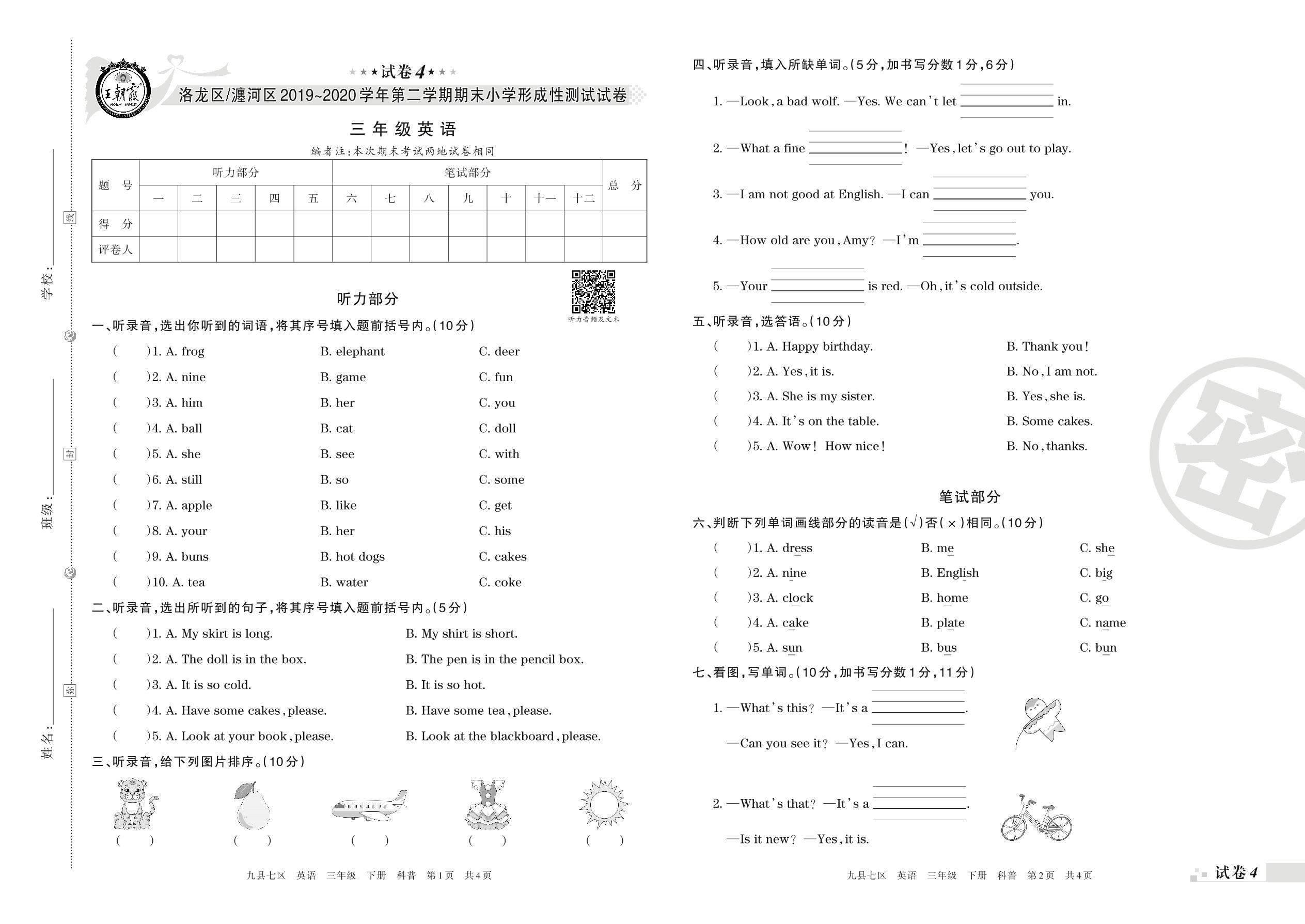 2019-2020学年第二学期洛阳市洛龙区、瀍河区三年级英语试卷(科普版)【4】