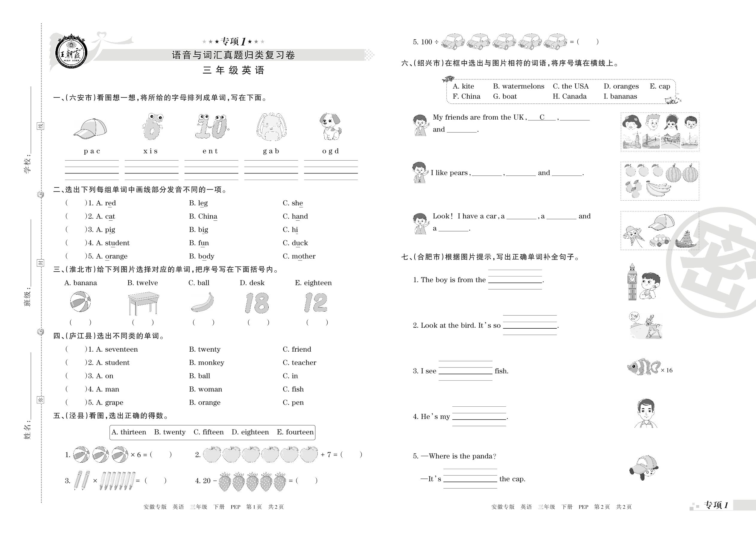 王朝霞期末专项卷——语音与词汇、句子真题归类复习三年级下册英语(PEP版)【0】