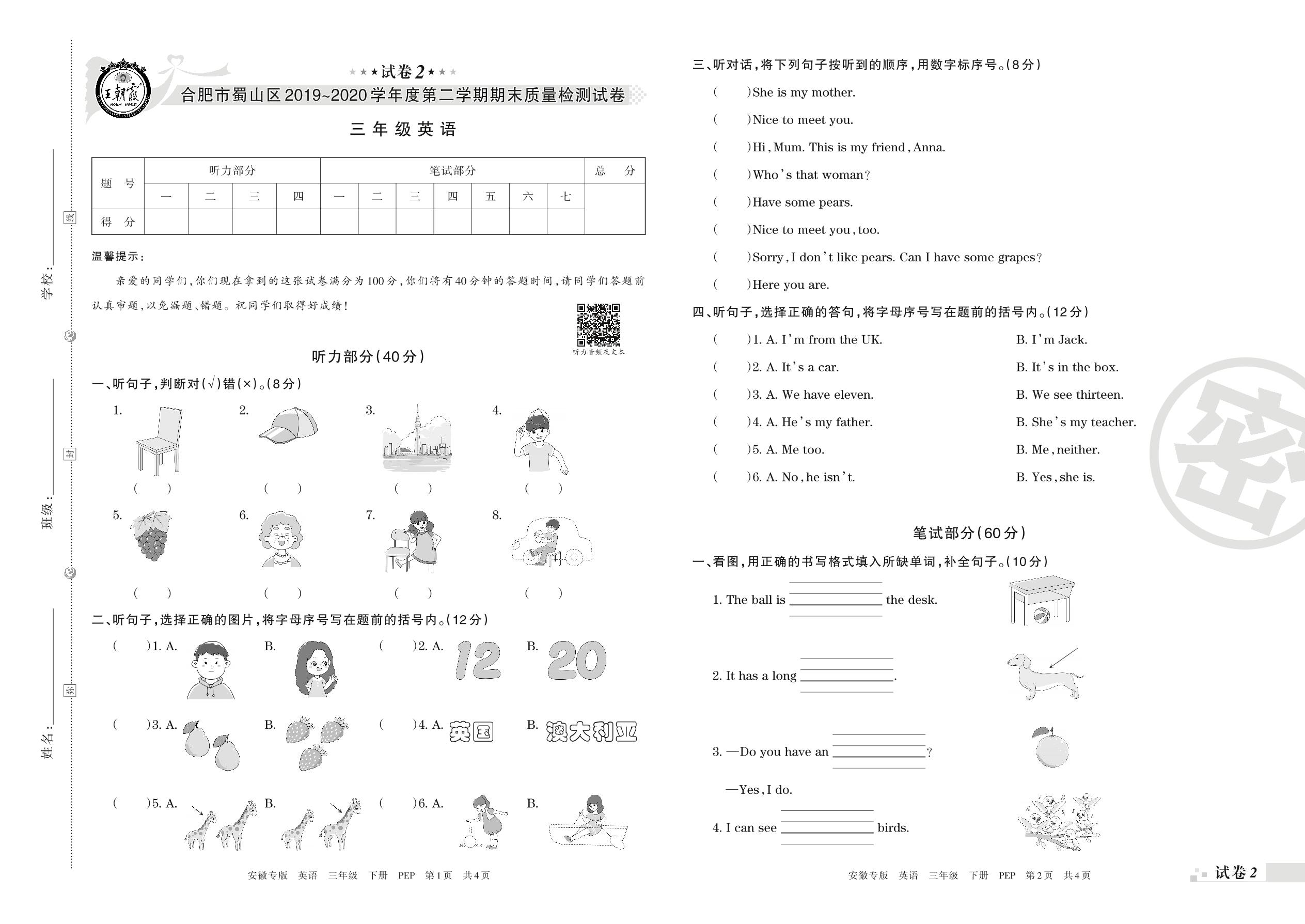 2019-2020学年第二学期合肥市蜀山区三年级英语试卷(PEP版)【2】