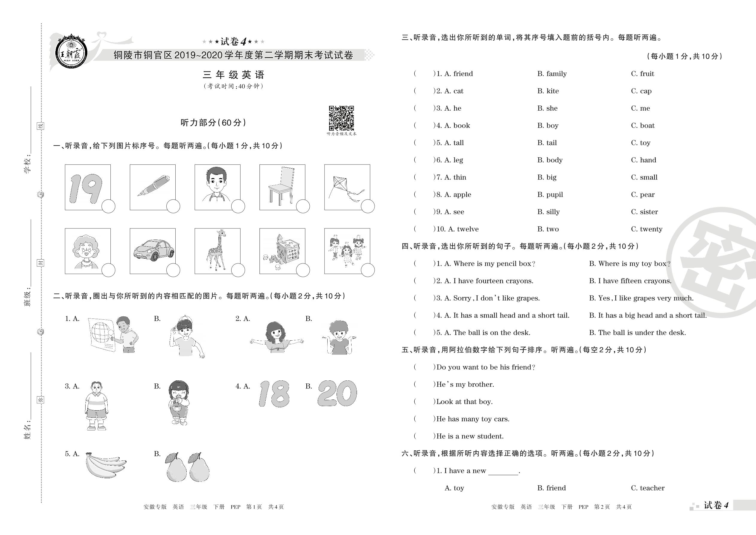 2019-2020学年第二学期铜陵市铜官区三年级英语试卷(PEP版)【4】