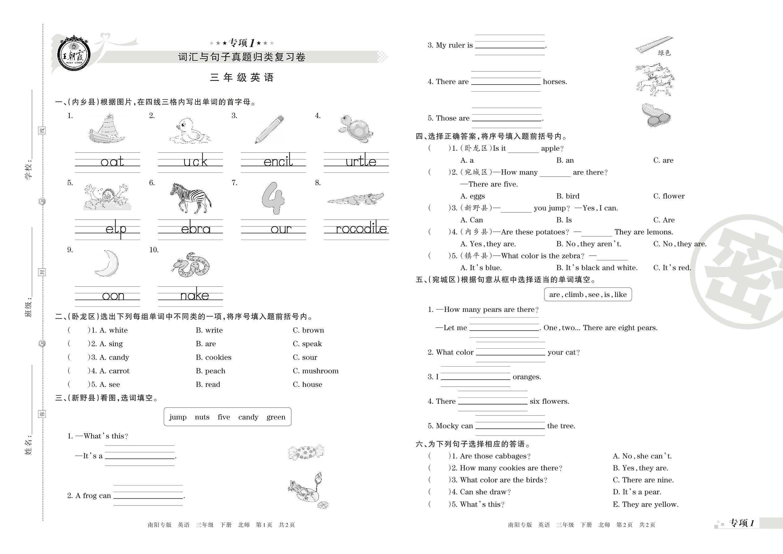 王朝霞期末专项卷——词汇与句子、情景交际真题归类复习三年级下册英语(北师版)【0】