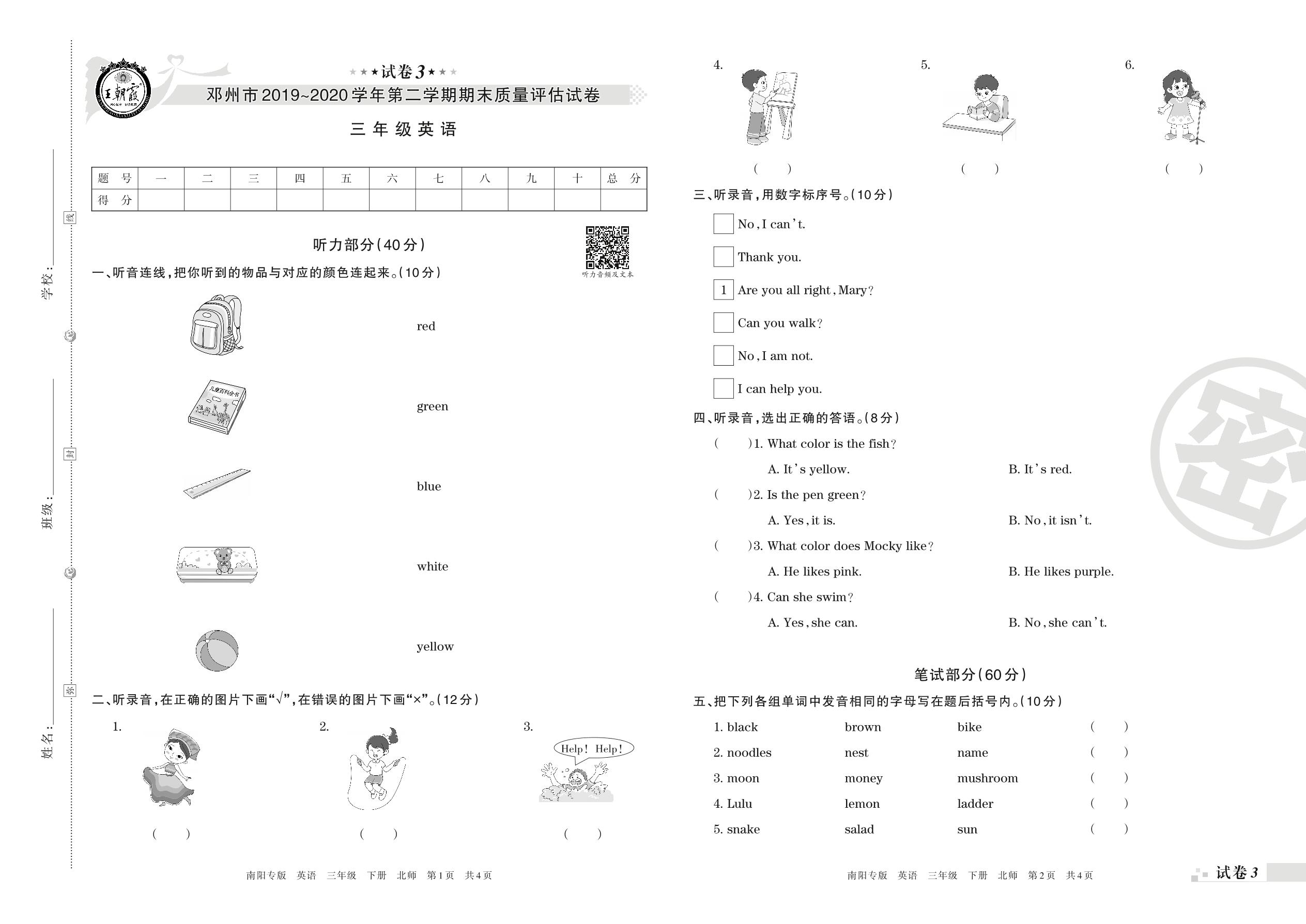 2019-2020学年第二学期邓州市三年级英语试卷(北师版)【3】
