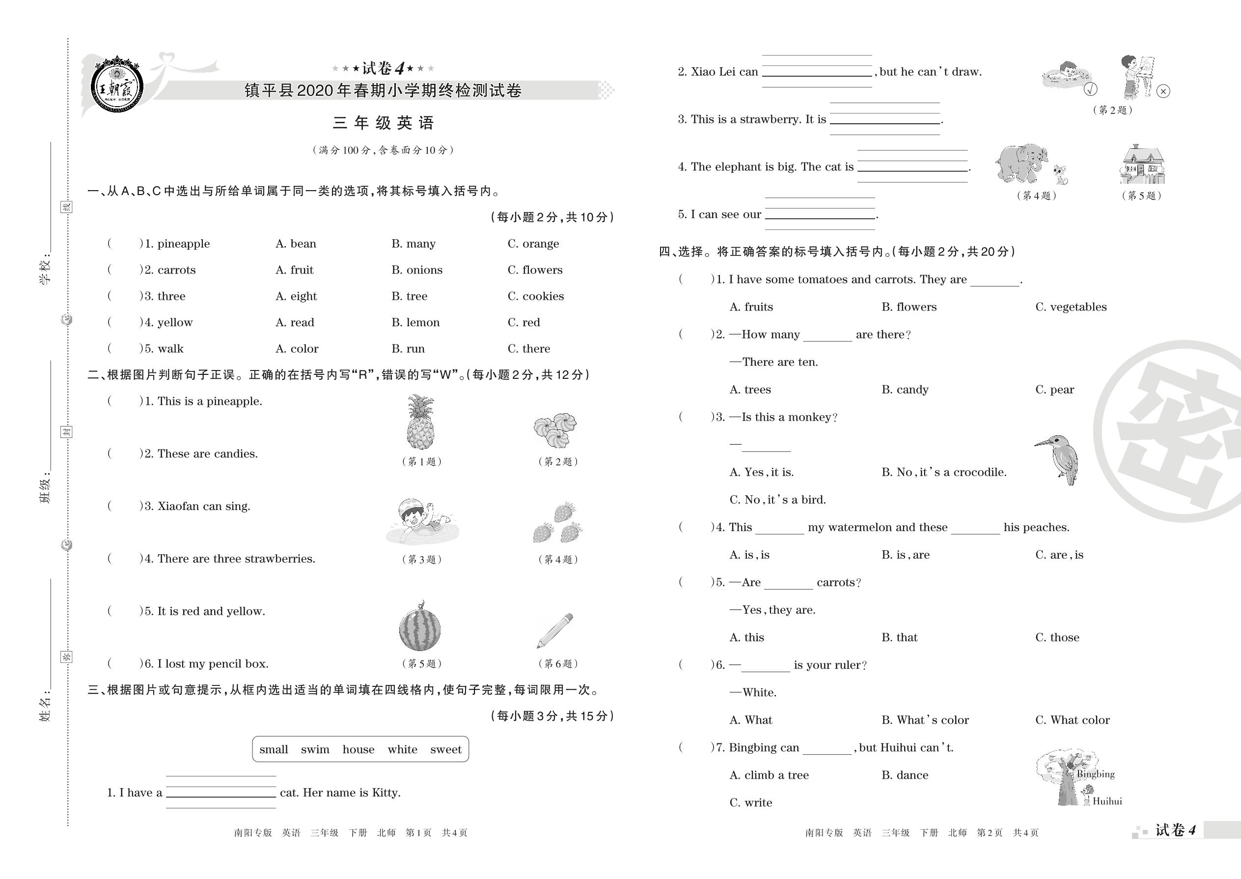 2019-2020学年第二学期南阳市镇平县三年级英语试卷(北师版)【4】