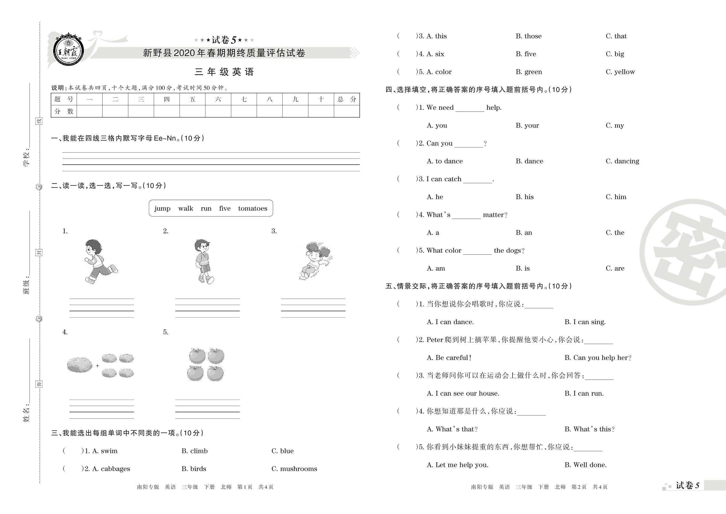 2019-2020学年第二学期南阳市新野县三年级英语试卷(北师版)【5】