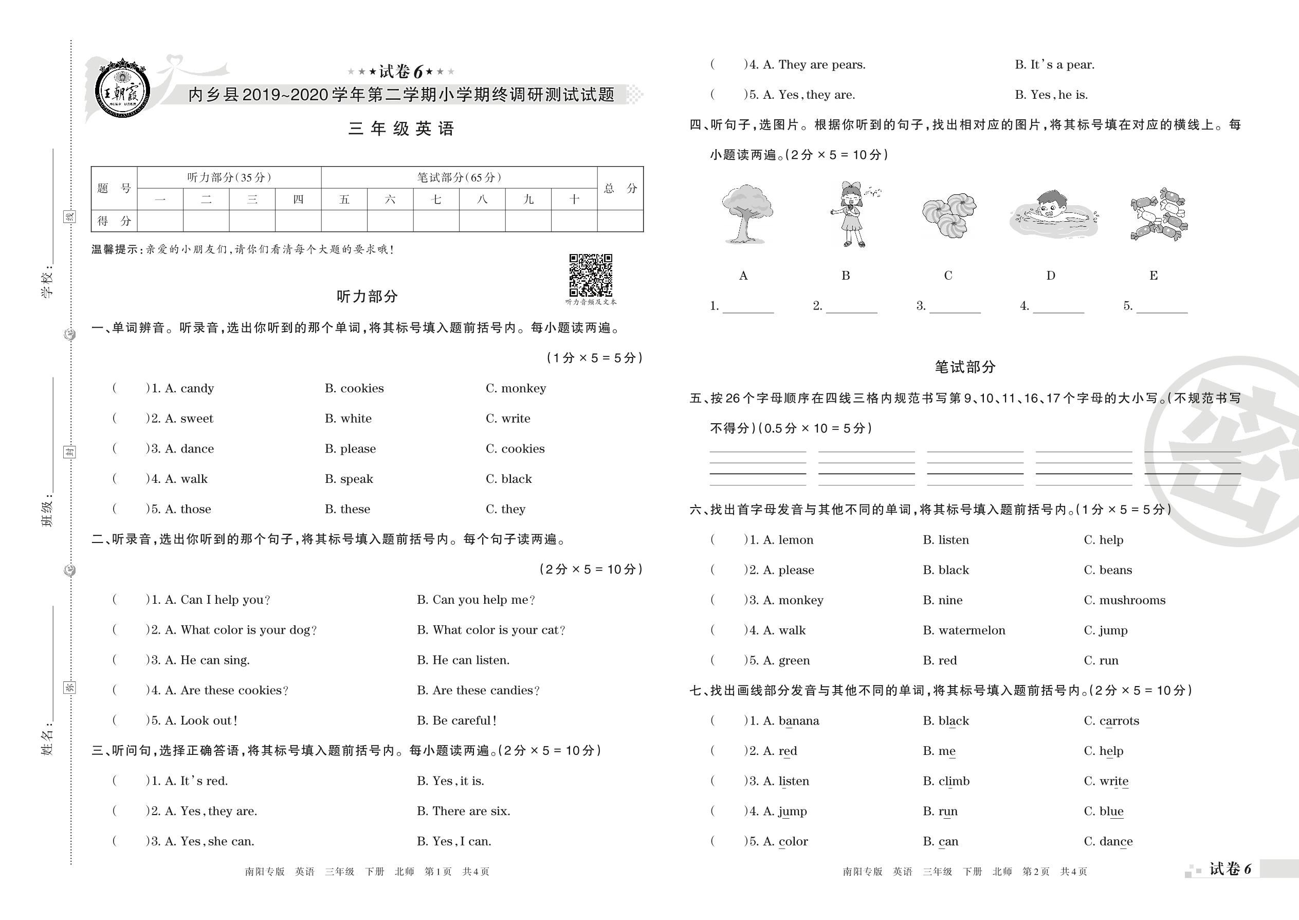 2019-2020学年第二学期南阳市内乡县三年级英语试卷(北师版)【6】