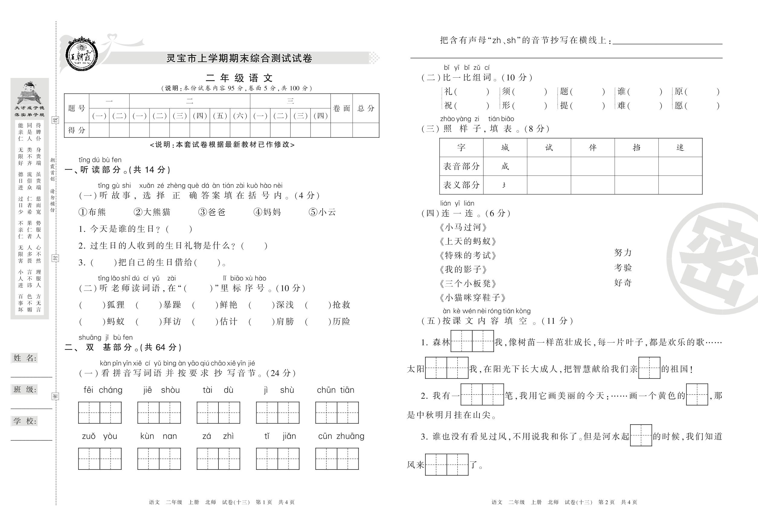 2016-2017学年第一学期灵宝市二年级语文试卷(北师版)【13】