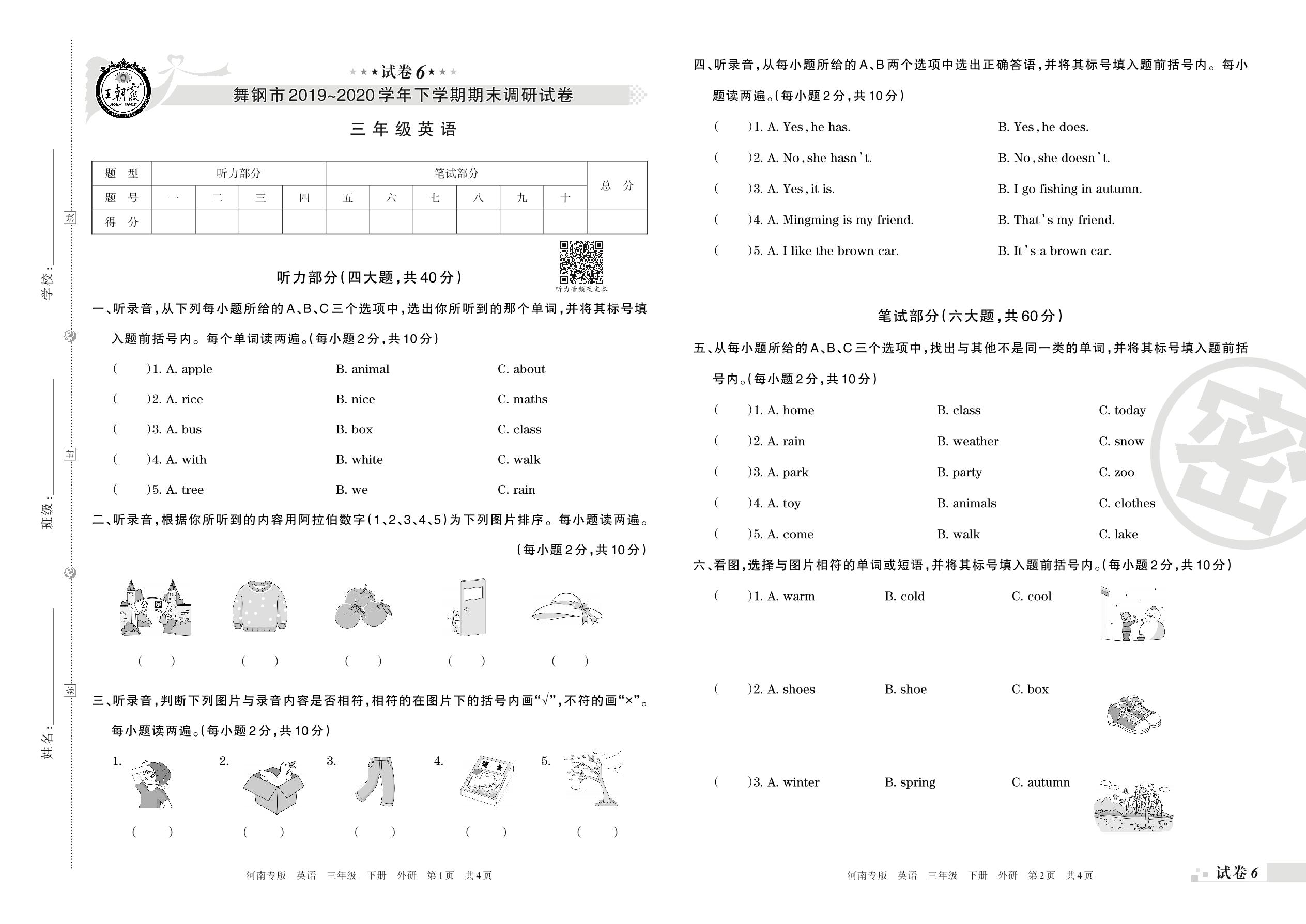 2019-2020学年第二学期舞钢市三年级英语试卷(外研版)【6】