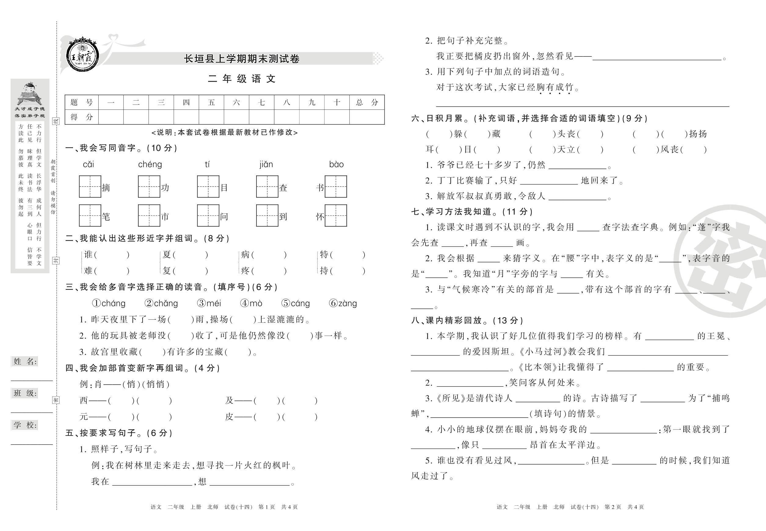 2016-2017学年第一学期新乡市长垣县二年级语文试卷(北师版)【14】