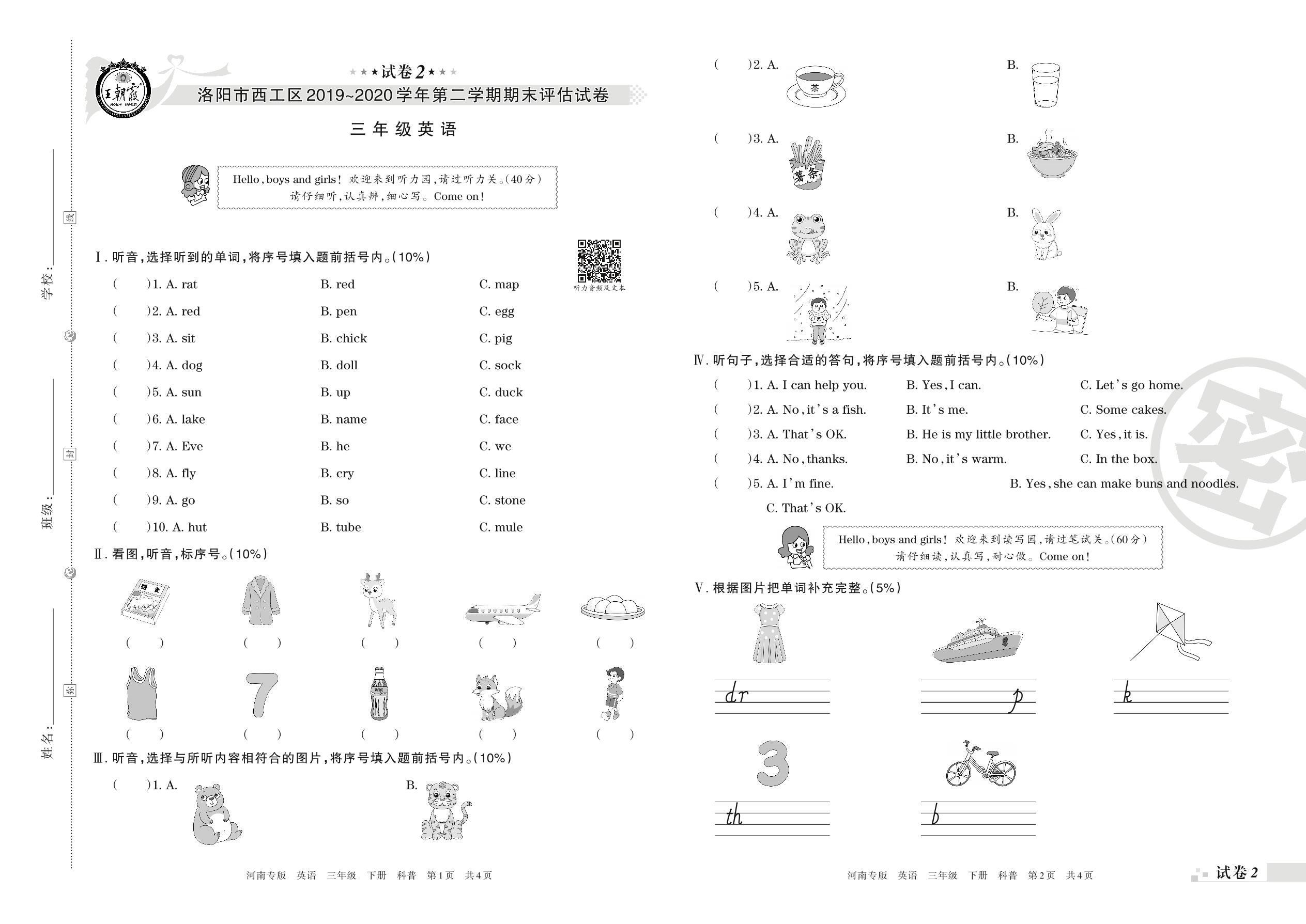 2019-2020学年第二学期洛阳市西工区三年级英语试卷(科普版)【2】