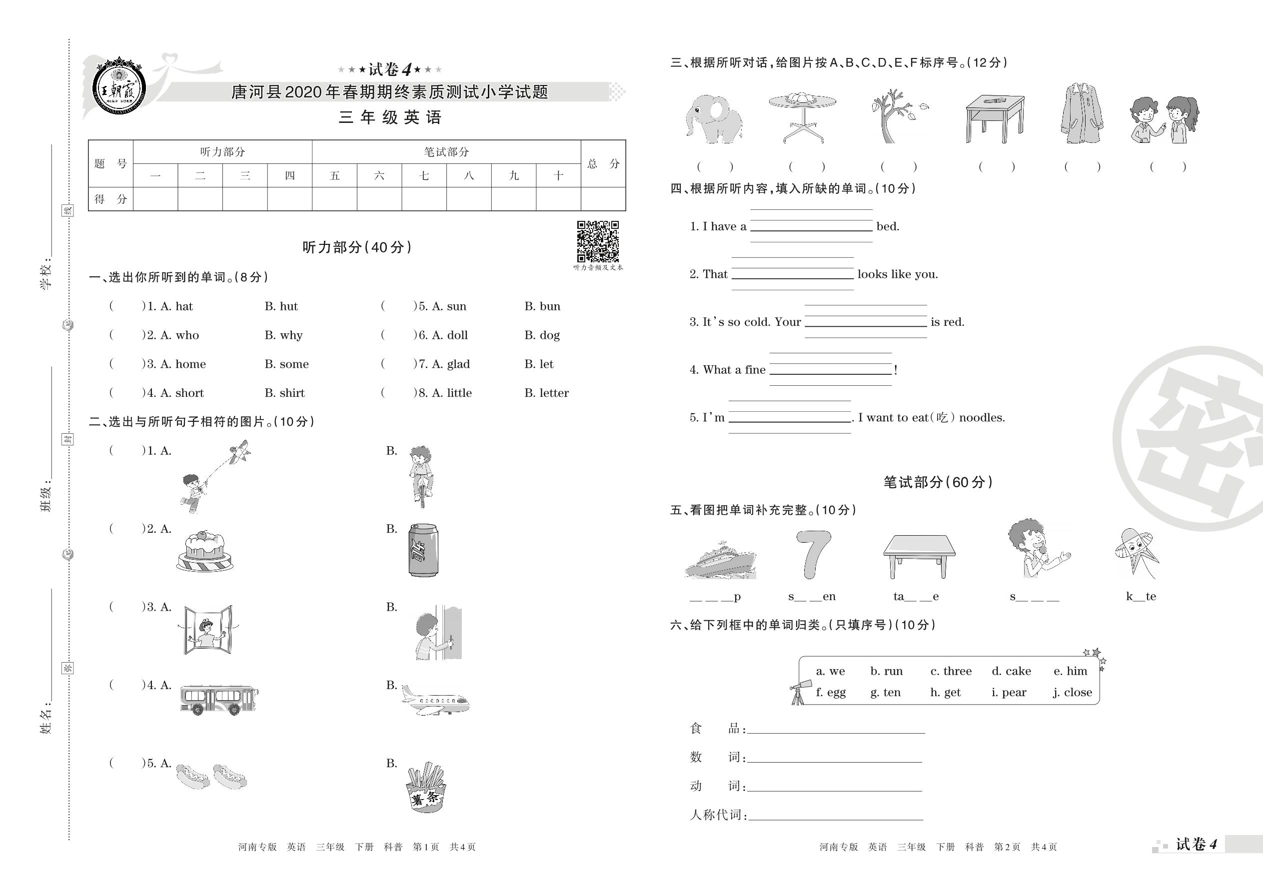 2019-2020学年第二学期南阳市唐河县三年级英语试卷(科普版)【4】