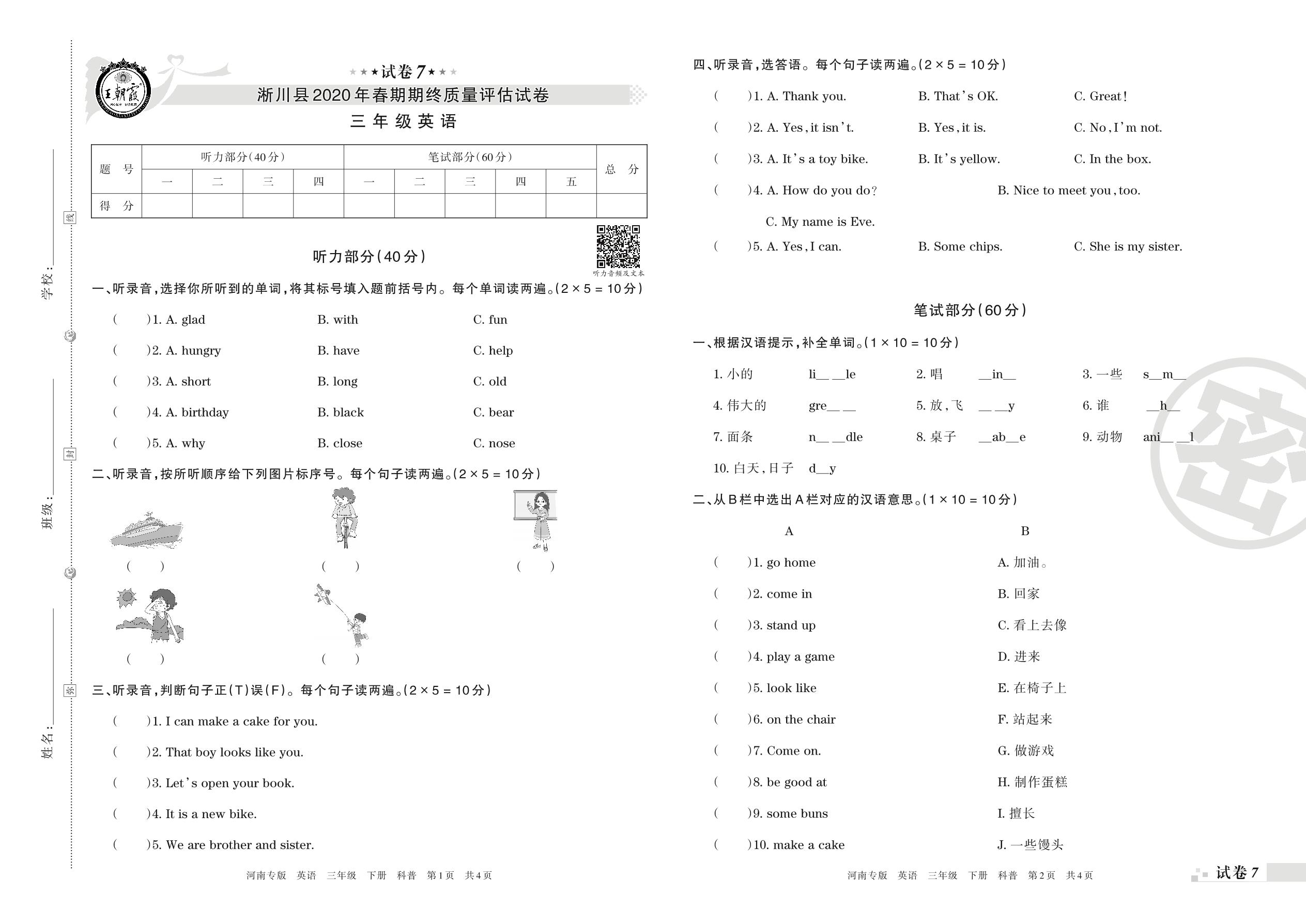 2019-2020学年第二学期南阳市淅川县三年级英语试卷(科普版)【7】