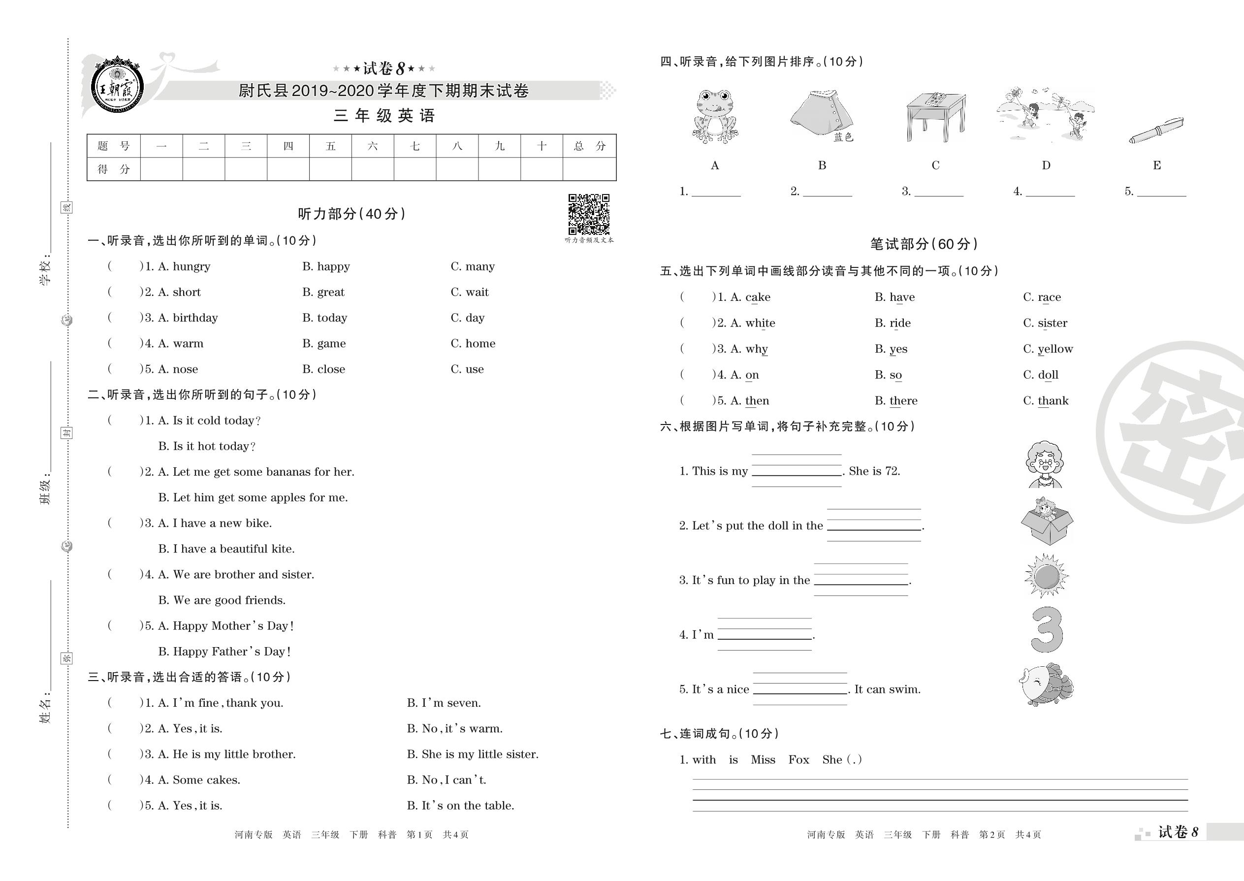 2019-2020学年第二学期开封市尉氏县三年级英语试卷(科普版)【8】