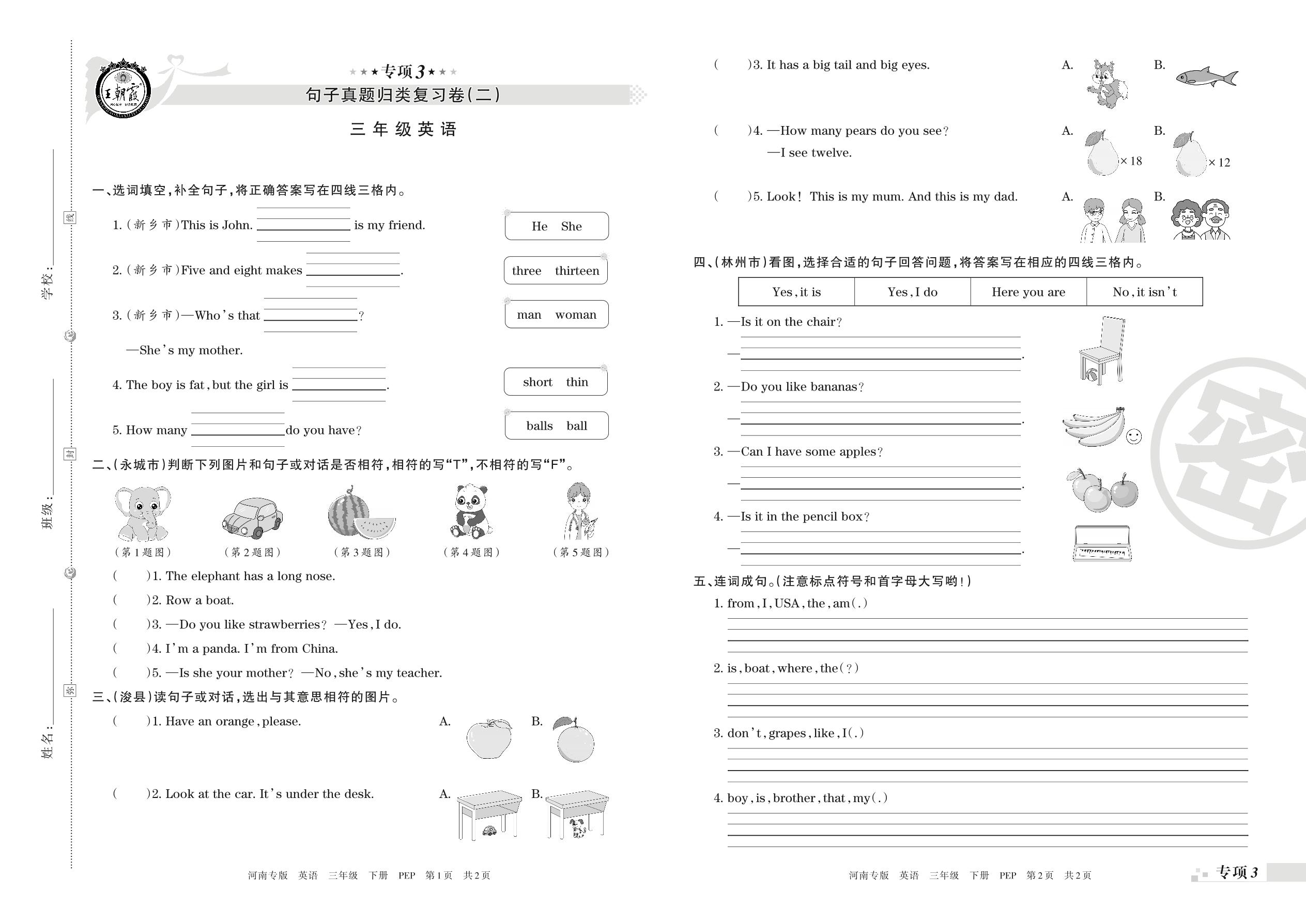 三年级英语人教PEP版(三起始)下册专项卷
