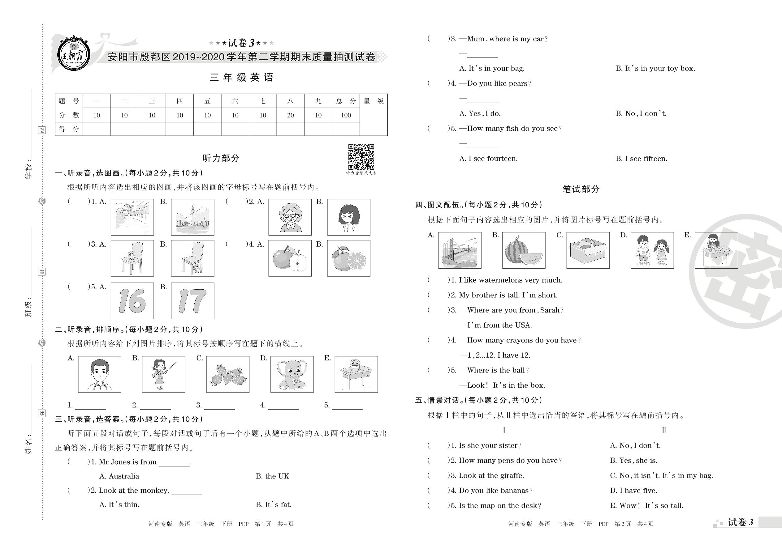 2019-2020学年第二学期安阳市殷都区三年级英语试卷(PEP版)【3】