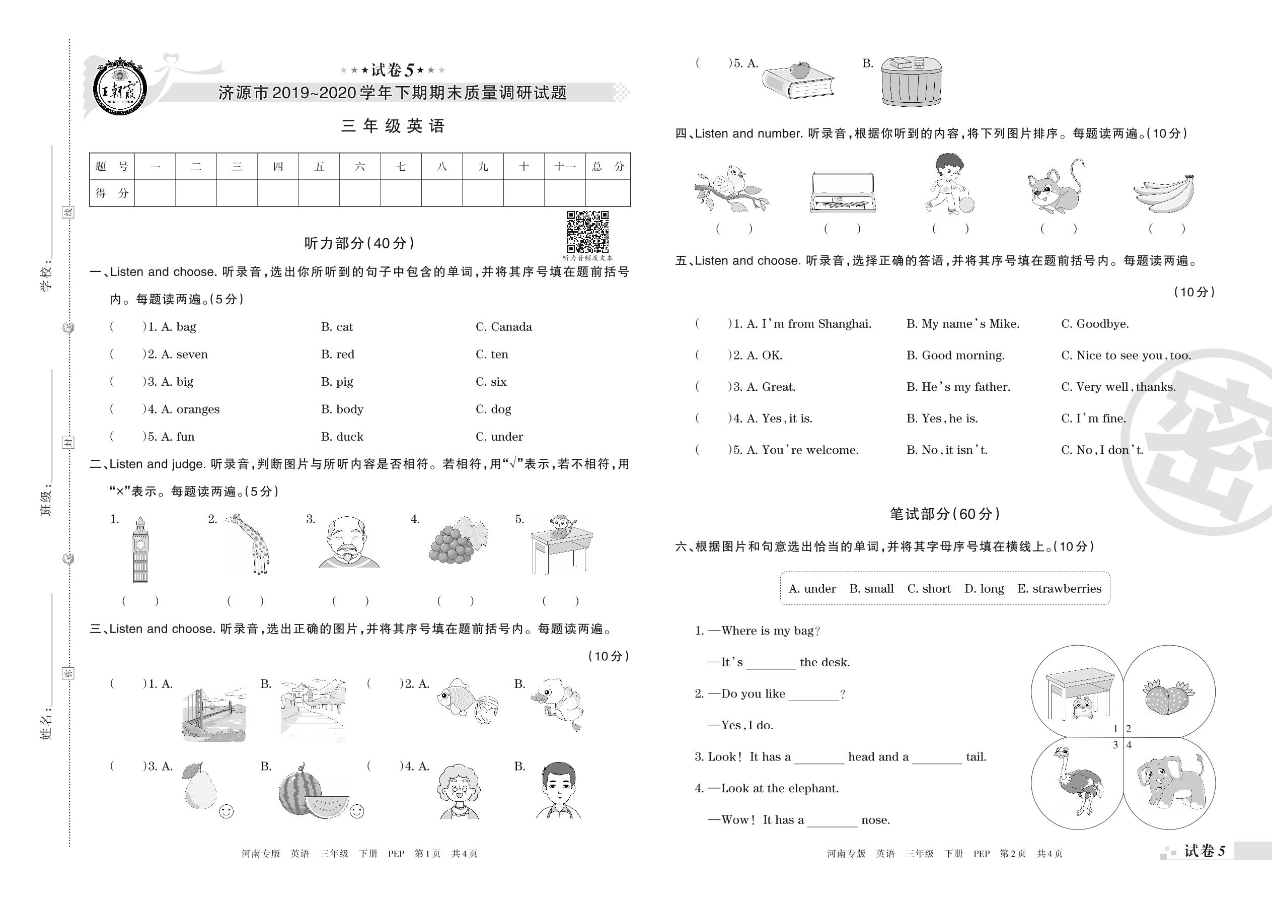 2019-2020学年第二学期济源市三年级英语试卷(PEP版)【5】