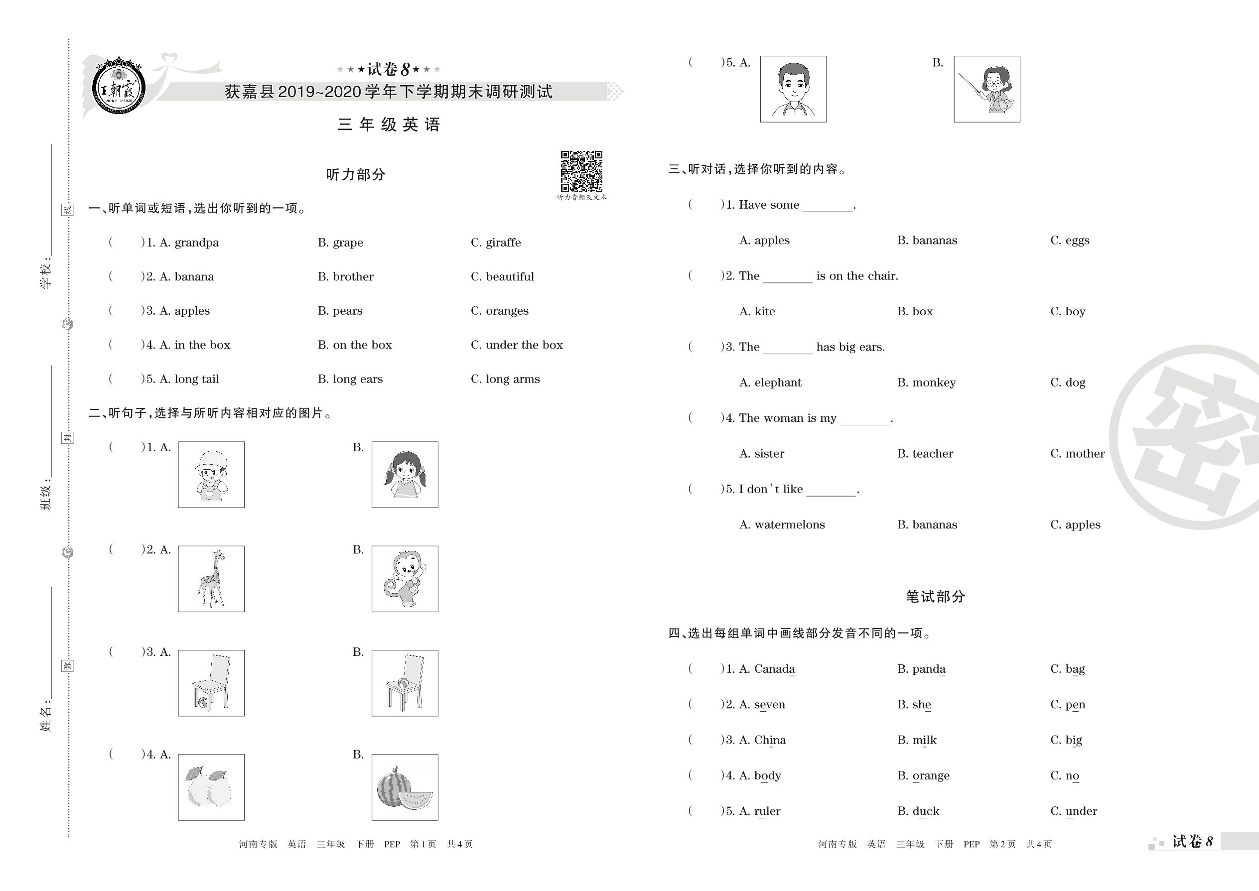 2019-2020学年第二学期新乡市获嘉县三年级英语试卷(PEP版)【8】