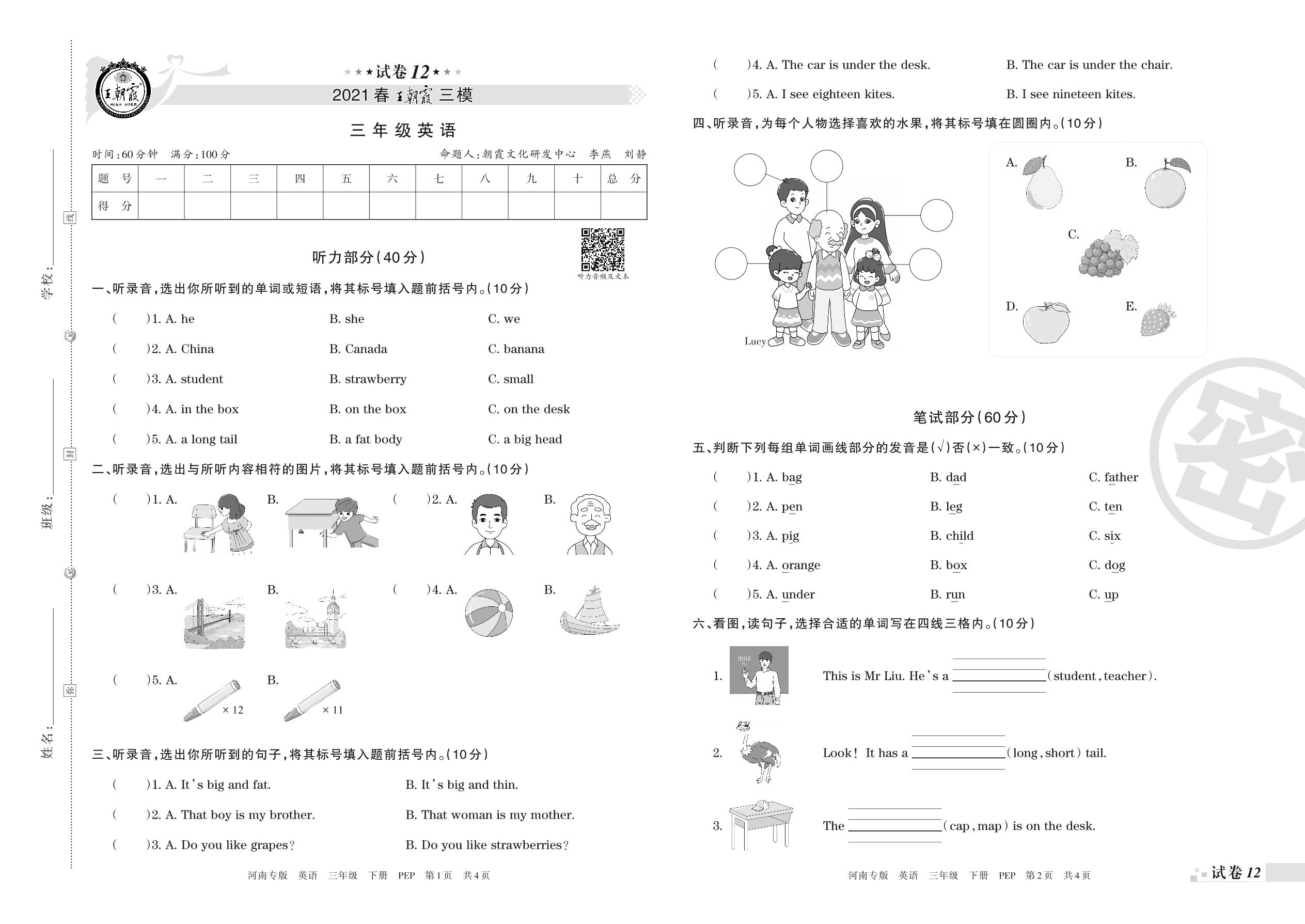 王朝霞期末模拟卷三年级下册英语(PEP版)_R210806182604【12】