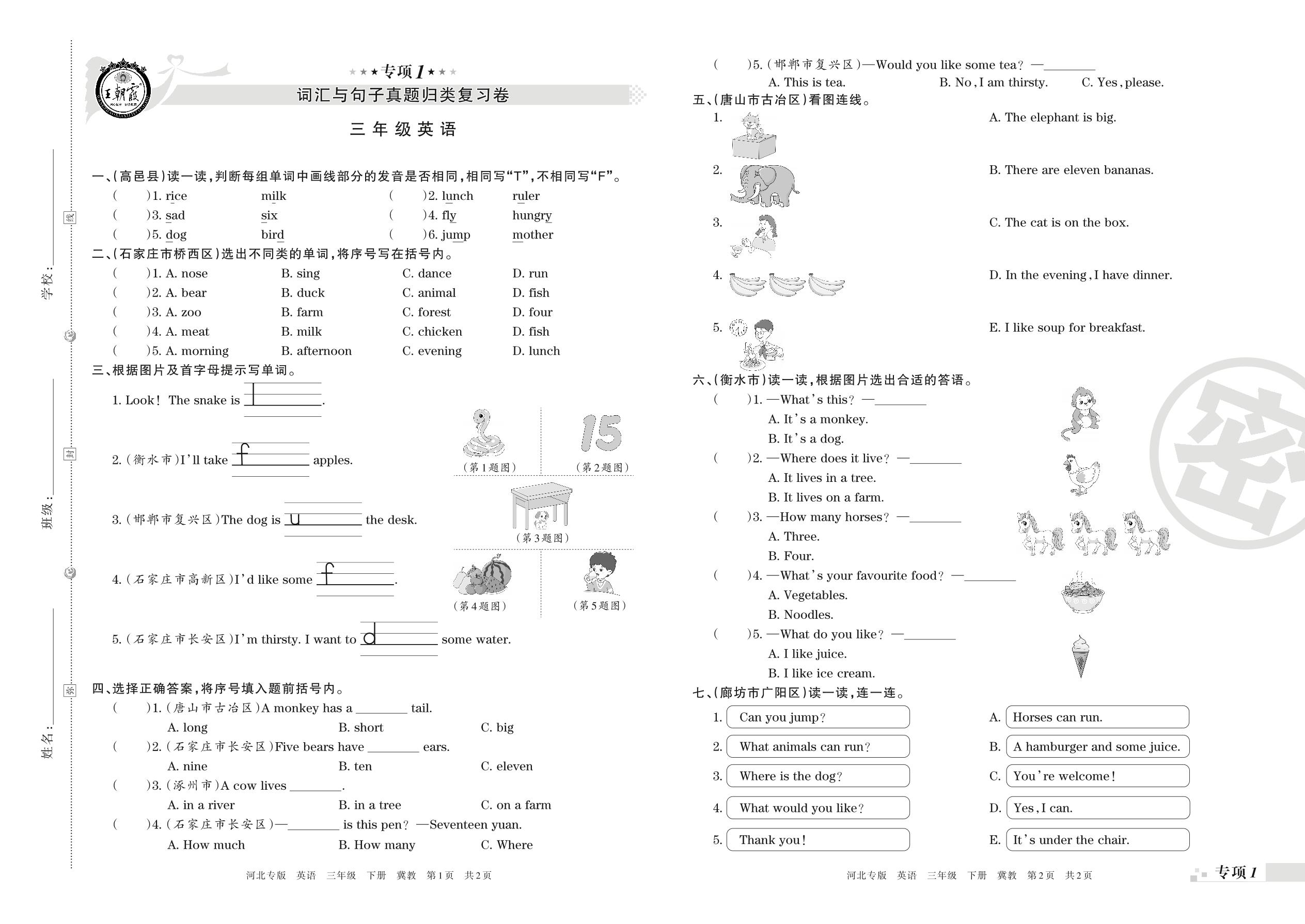 王朝霞期末专项卷——词汇与句子、情景交际真题归类复习三年级下册英语(冀教版)【0】