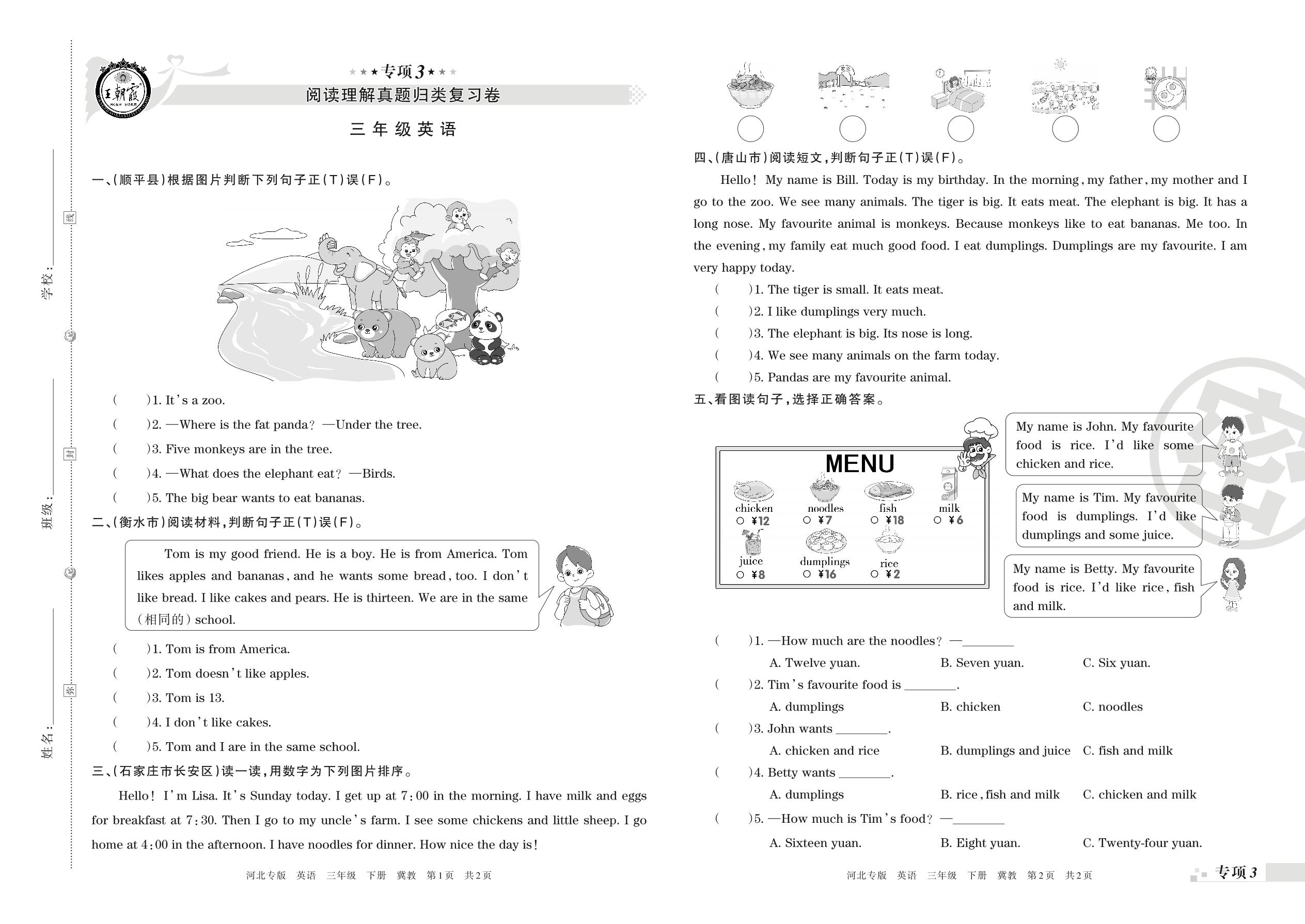 王朝霞期末专项卷——阅读理解真题归类复习、补全短文与任务型阅读三年级下册英语(冀教版)【0】