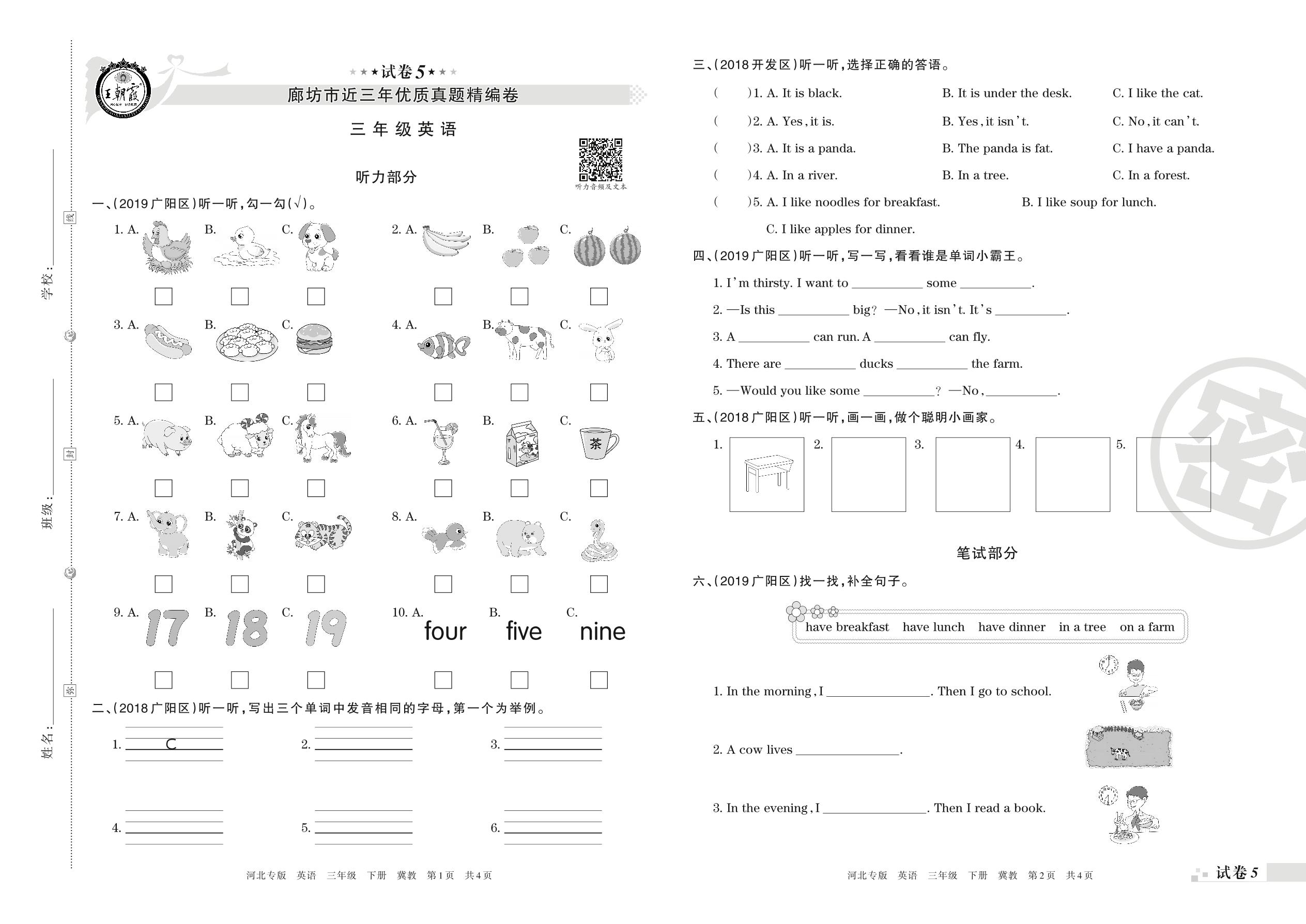 廊坊市近三年优质真题精编卷三年级下册英语(冀教版)【5】