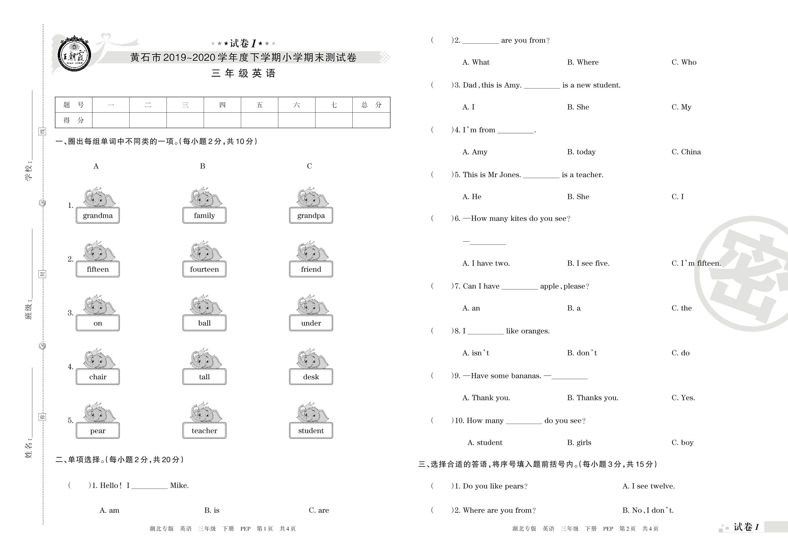 2019-2020学年第二学期黄石市三年级英语试卷(PEP版)【1】