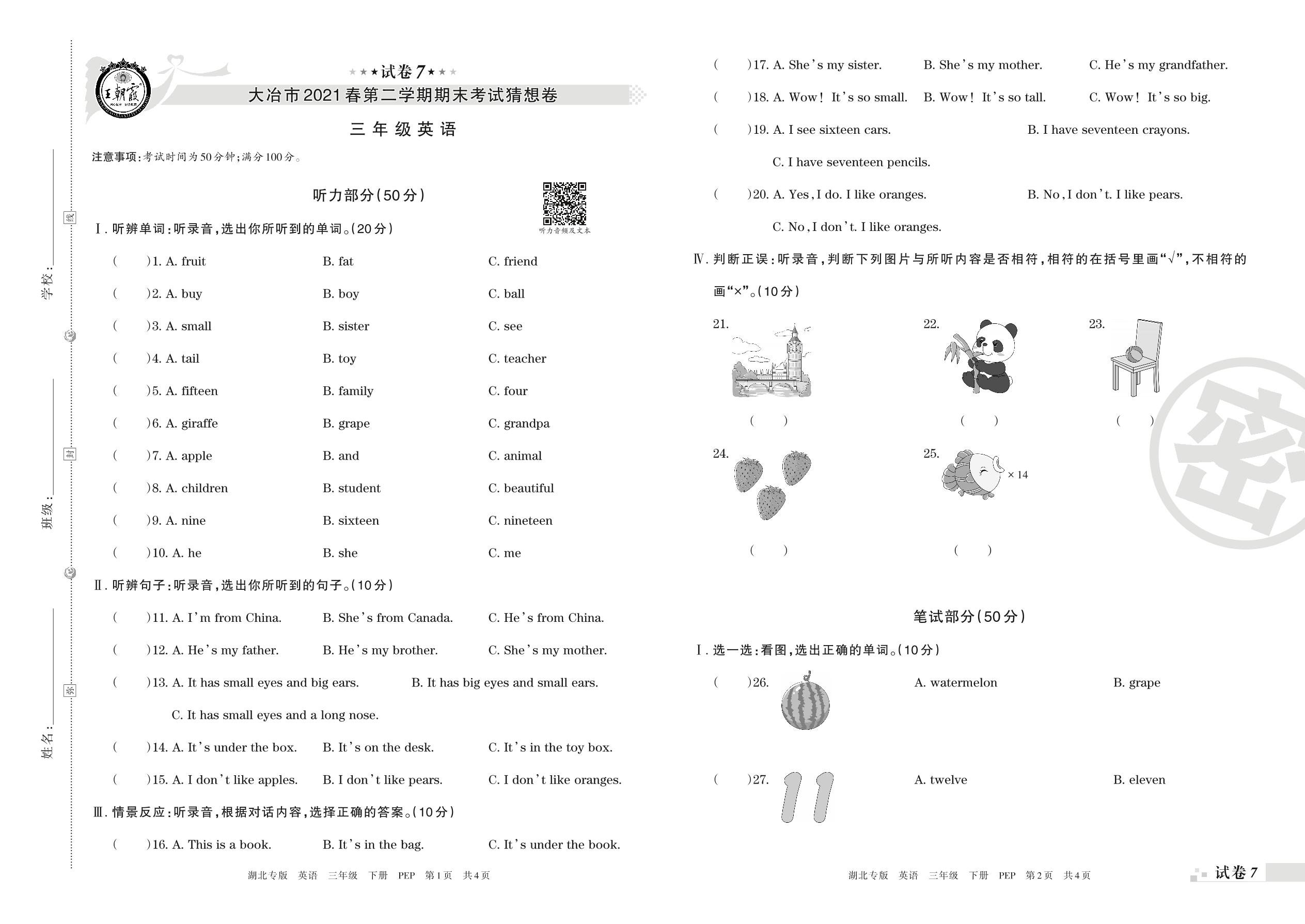 2020-2021学年第二学期大冶市三年级英语试卷(PEP版)【7】