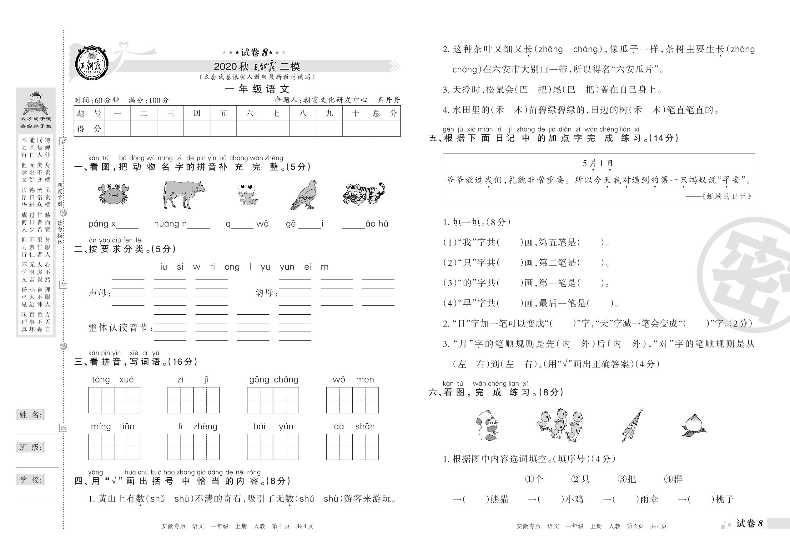 王朝霞期末模拟卷一年级上册语文(人教版)_R210731174702【8】