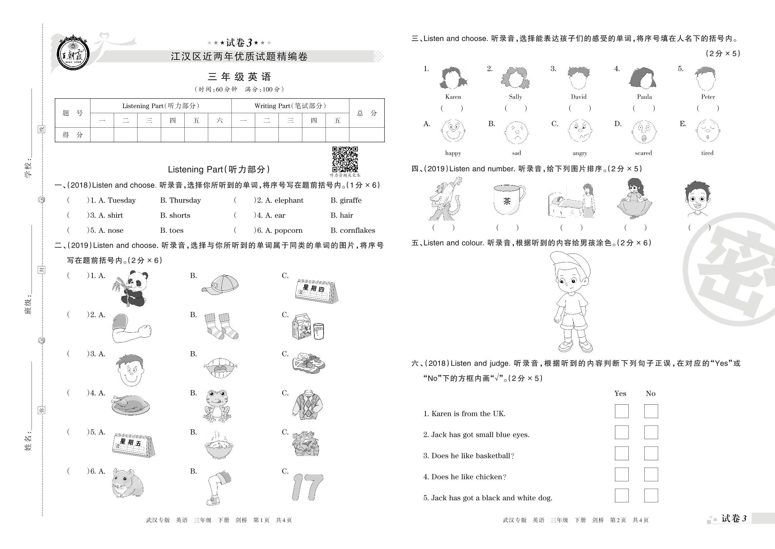 武汉市江汉区近两年优质试题精编卷三年级英语试卷(剑桥版)【3】