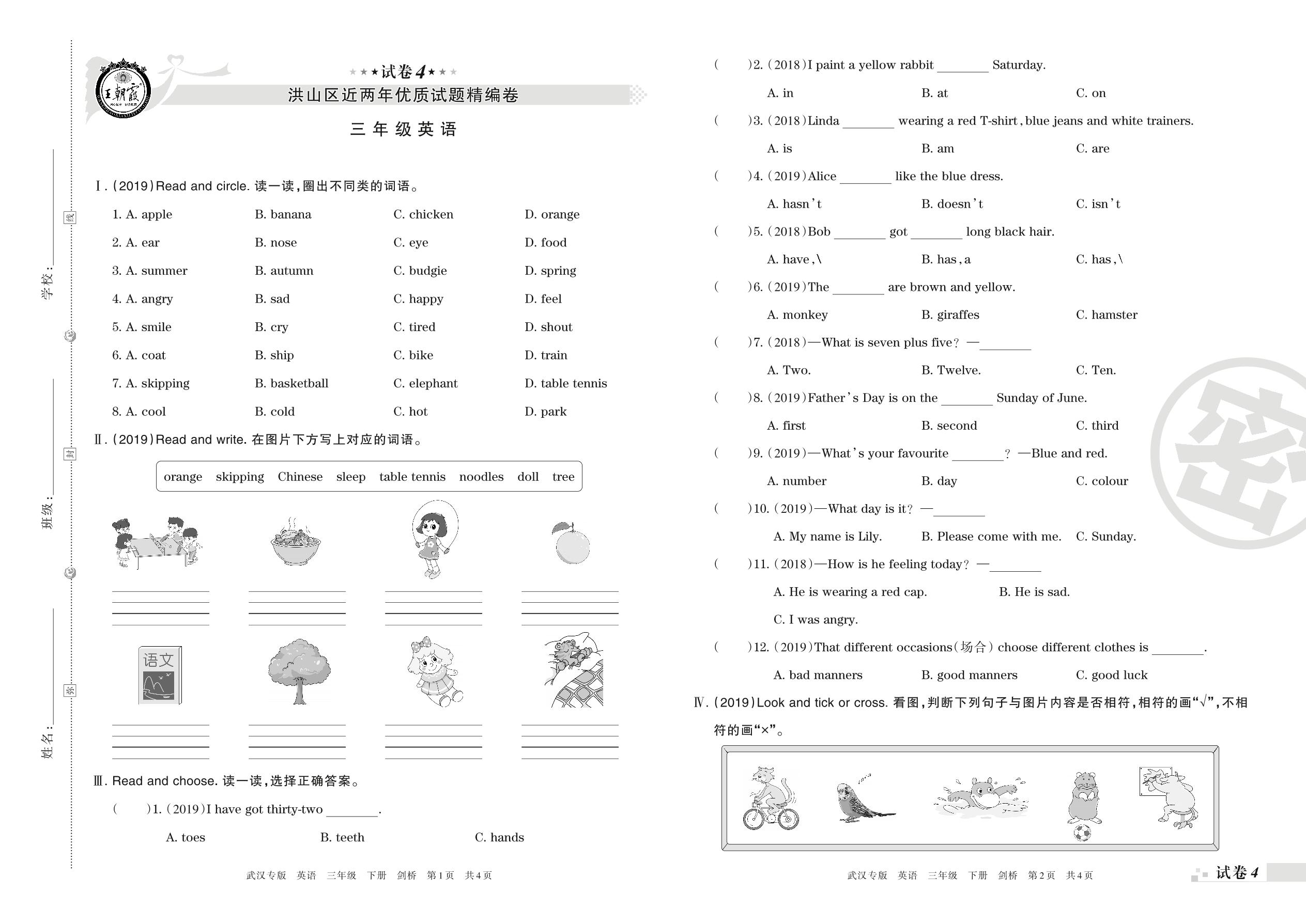 武汉市洪山区近两年优质试题精编卷三年级英语试卷(剑桥版)【4】