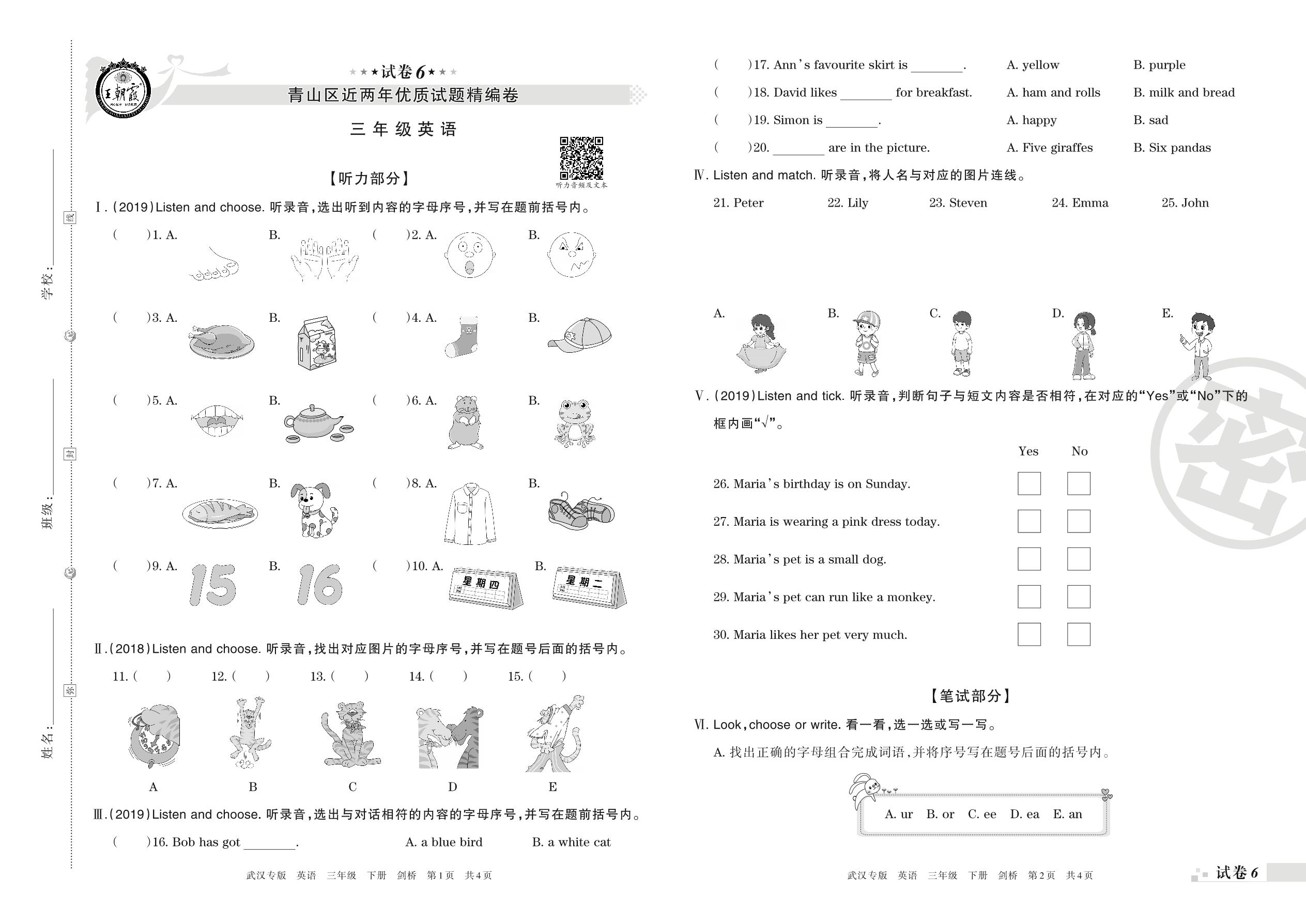 武汉市青山区近两年优质试题精编卷三年级英语试卷(剑桥版)【6】