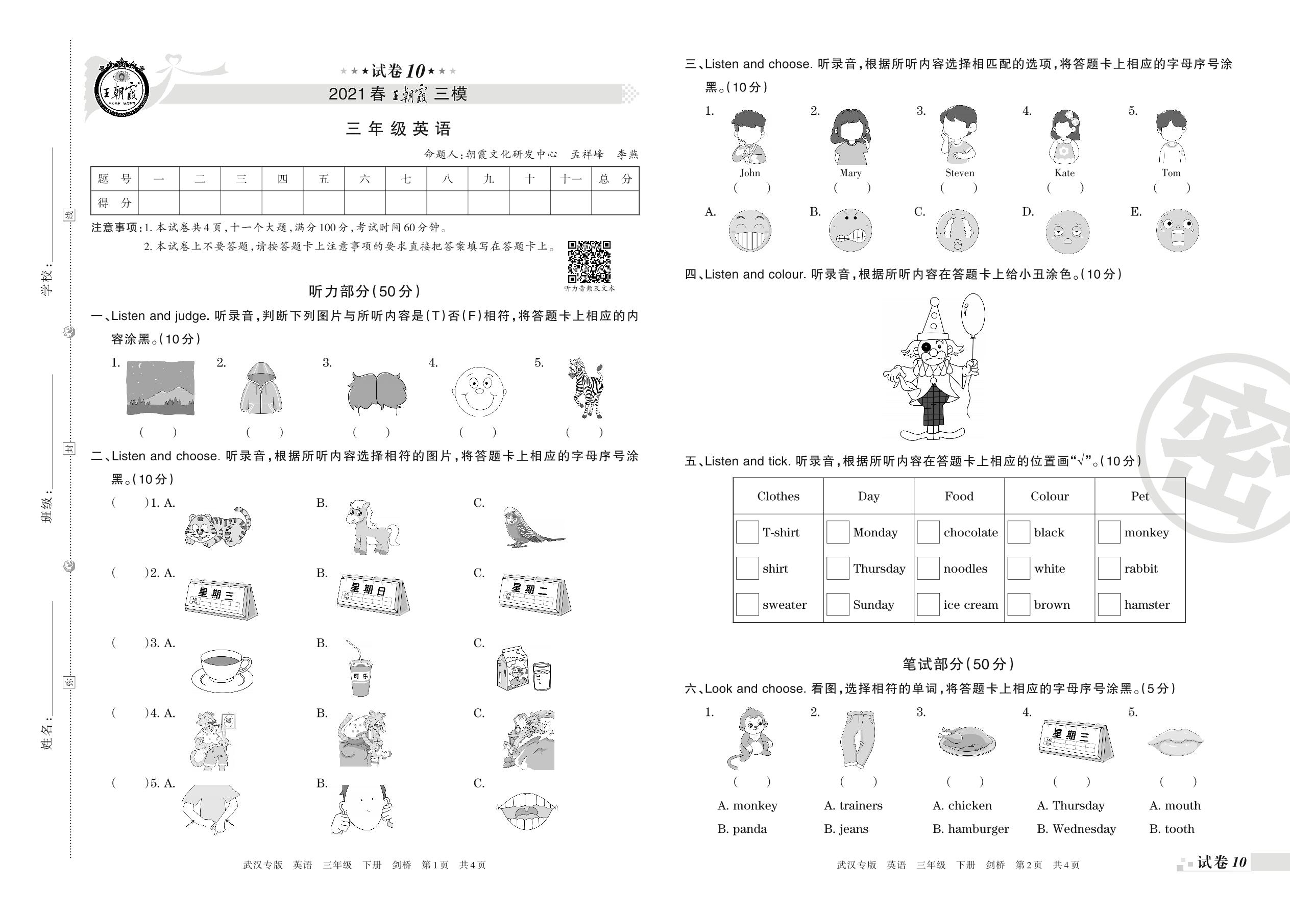 王朝霞期末模拟卷三年级下册英语(剑桥版)【10】