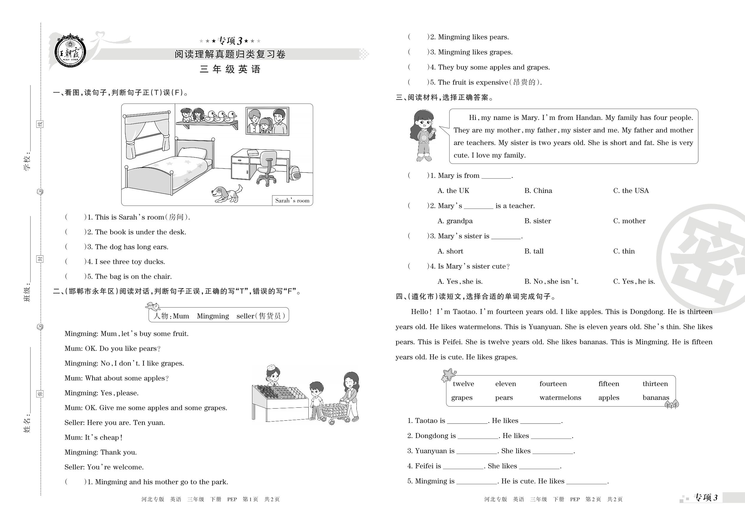 王朝霞期末专项卷——阅读理解真题归类复习、任务型阅读三年级下册英语(PEP版)_R210806182932【0】